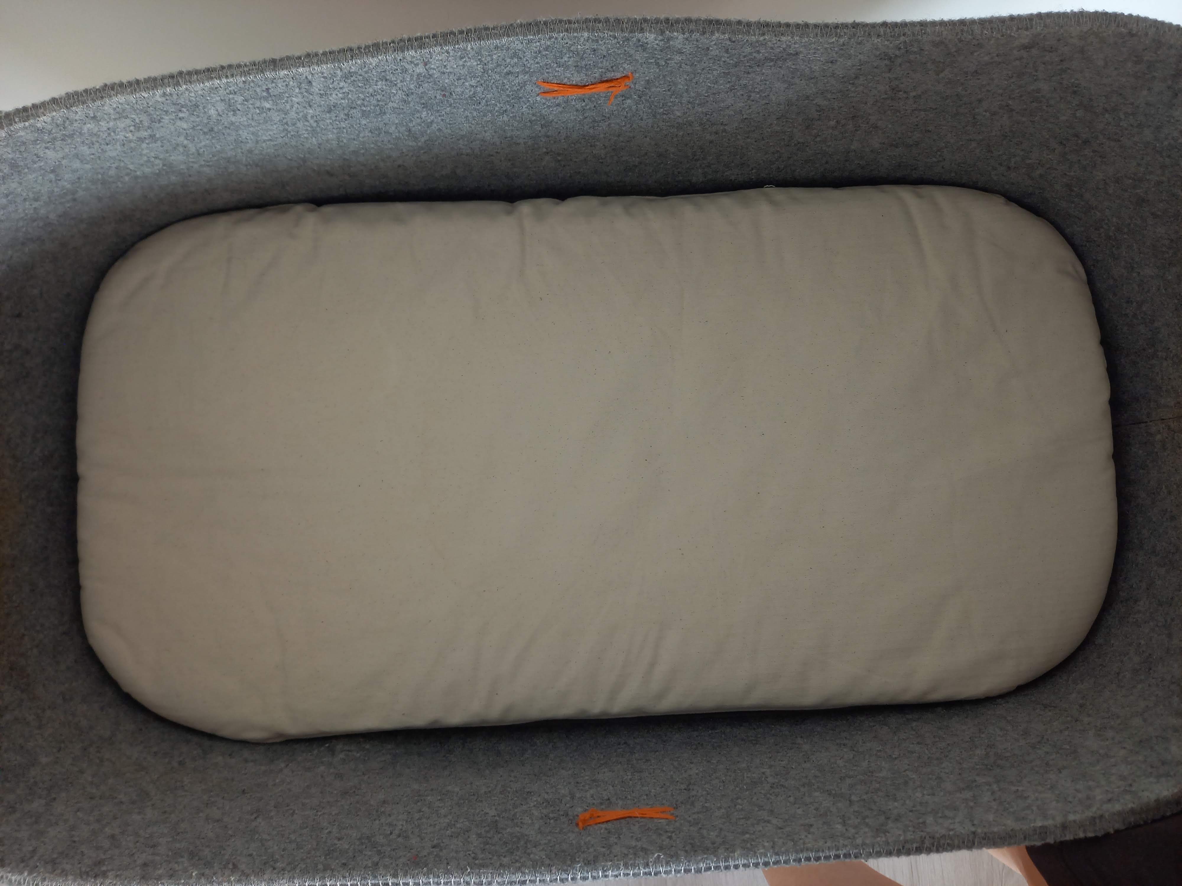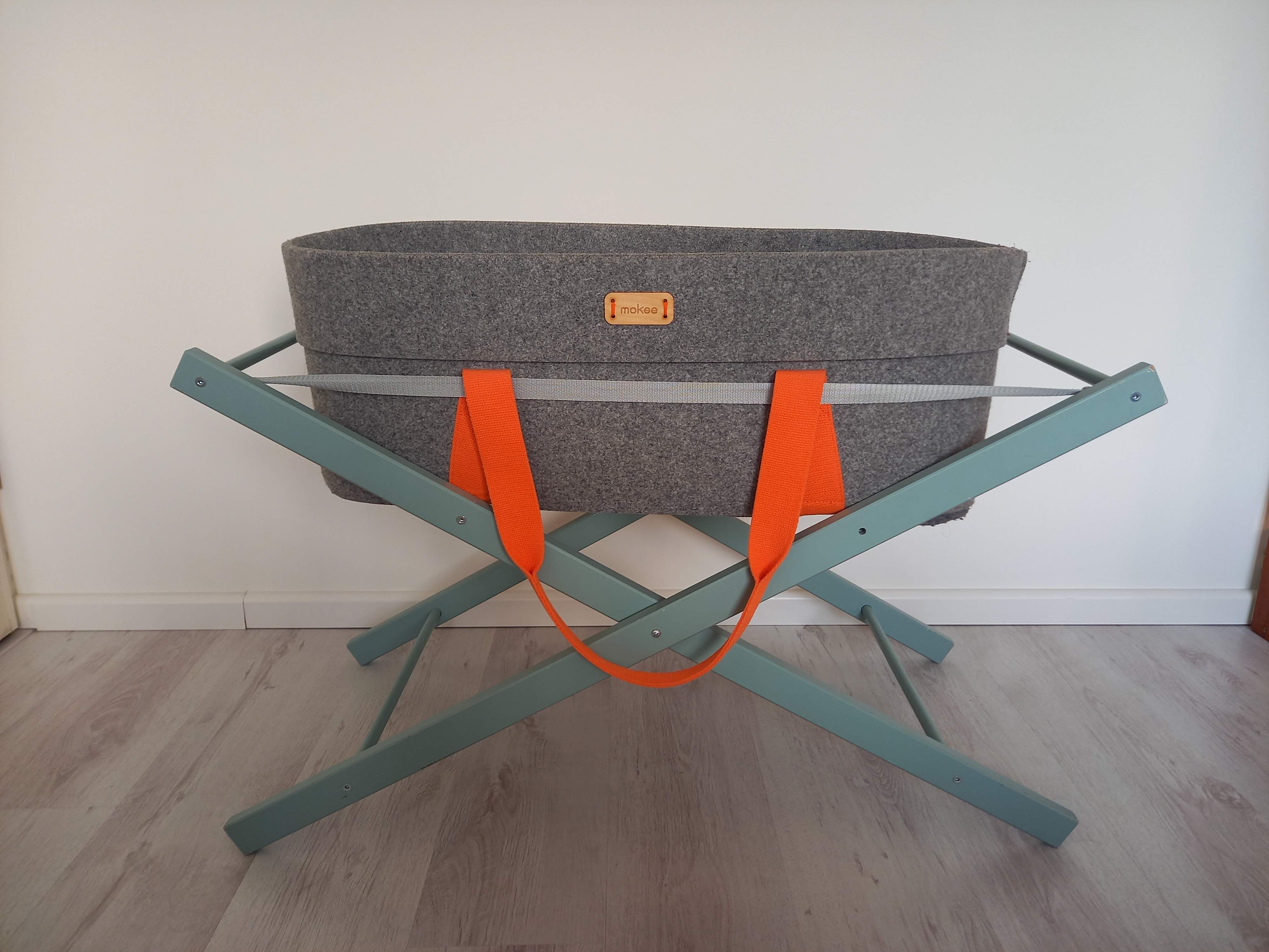 Mooie Mokee wieg voor de eerste maanden van de baby. Erg leuk om te gebruiken en gemakkelijk door het huis te verplaatsen, het wiegje kan worden gescheiden van de driepoot (die ook kan worden ingeklapt).