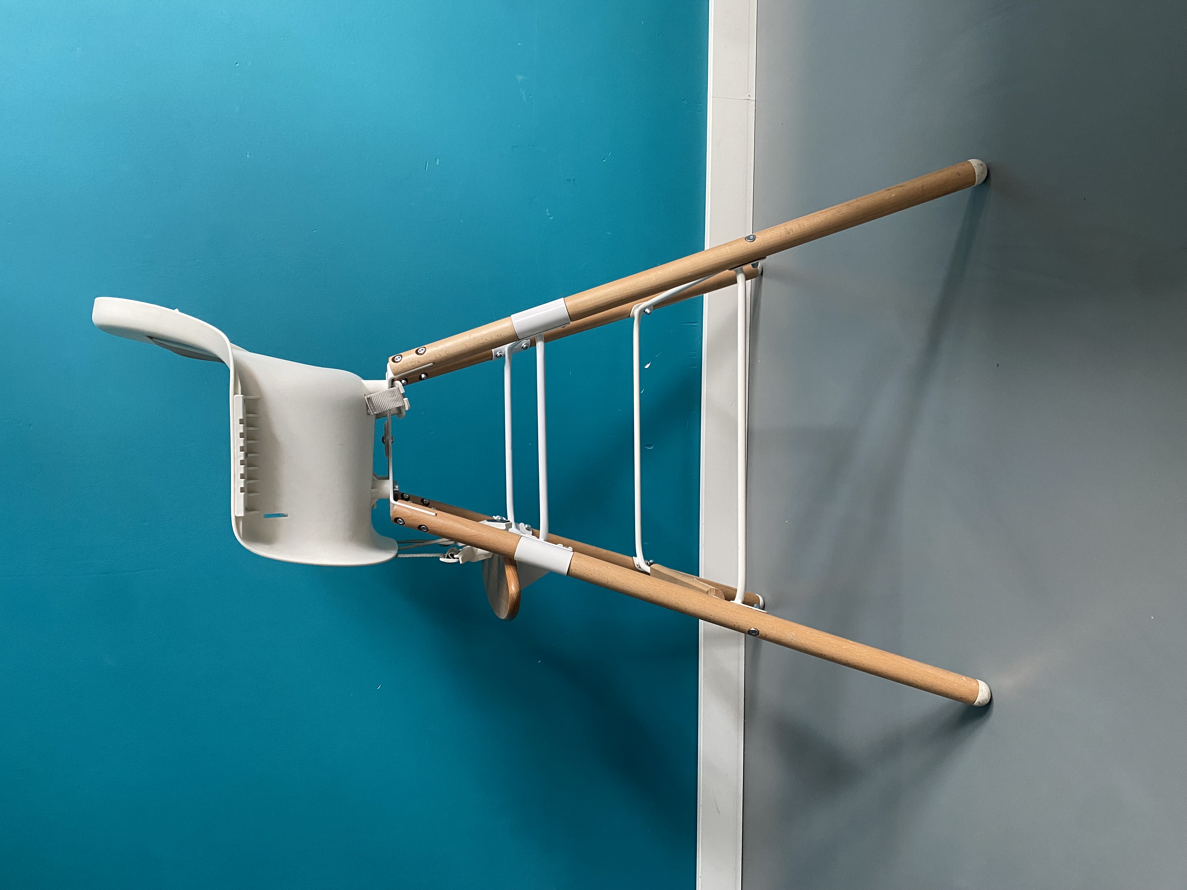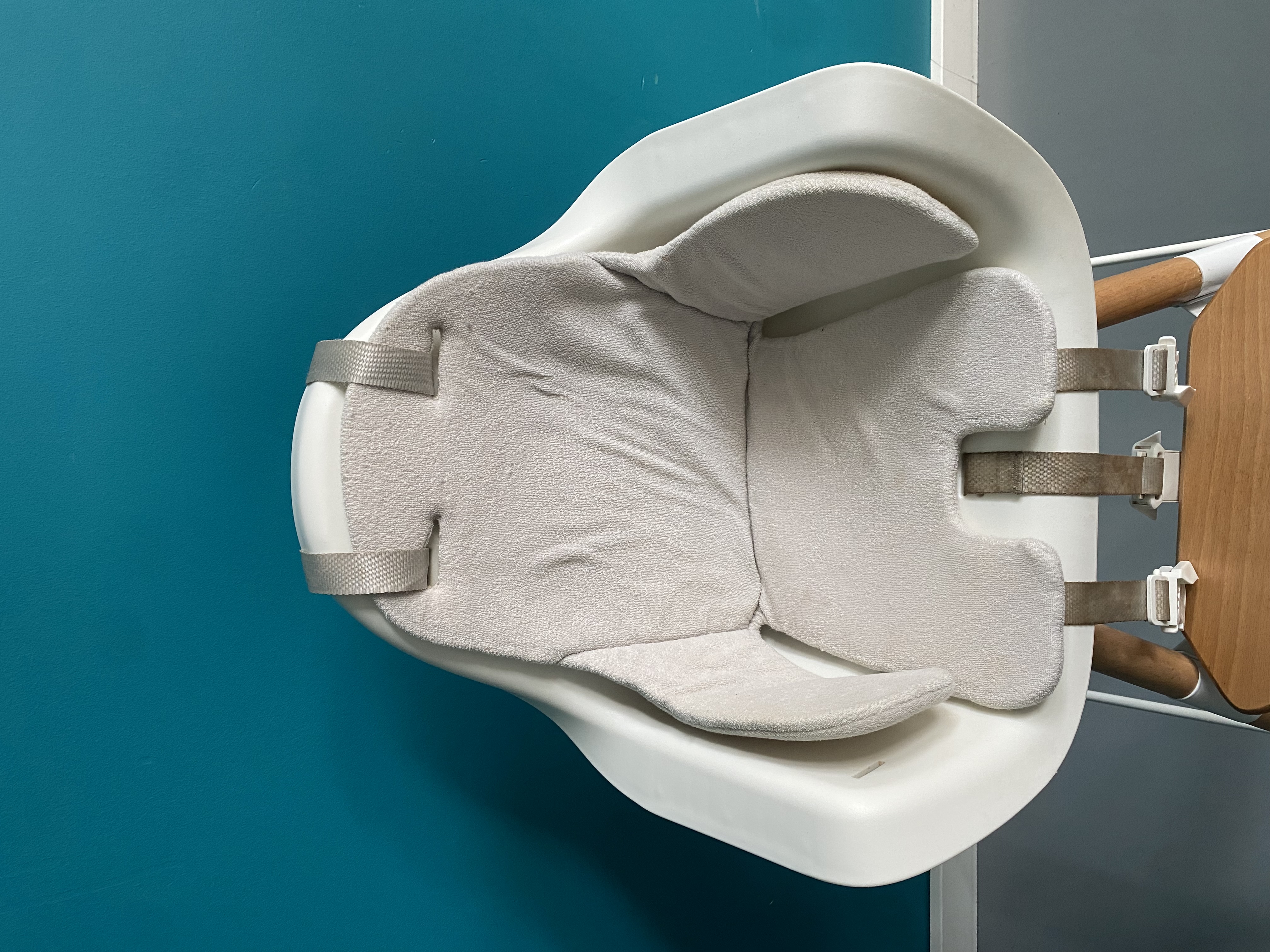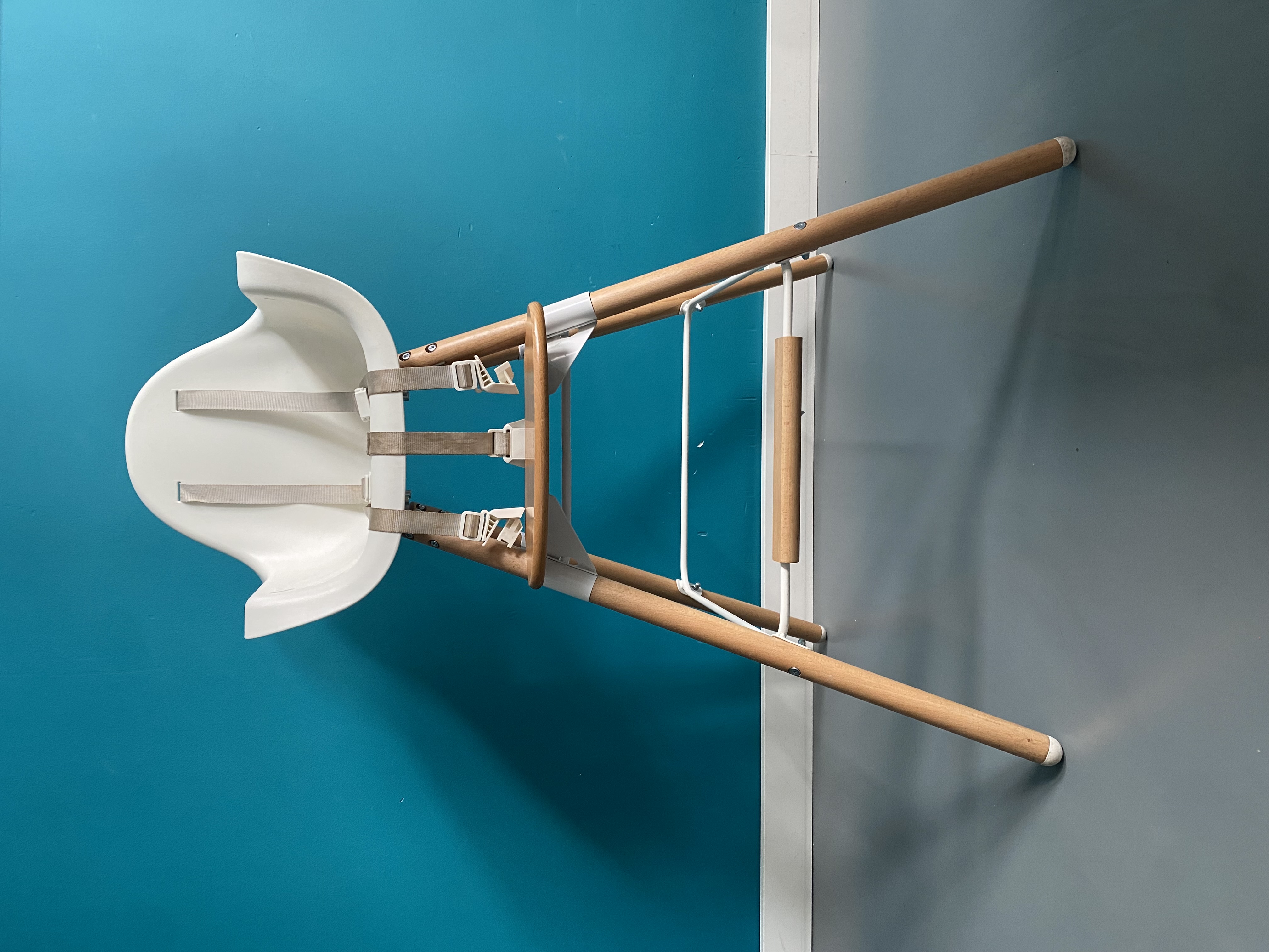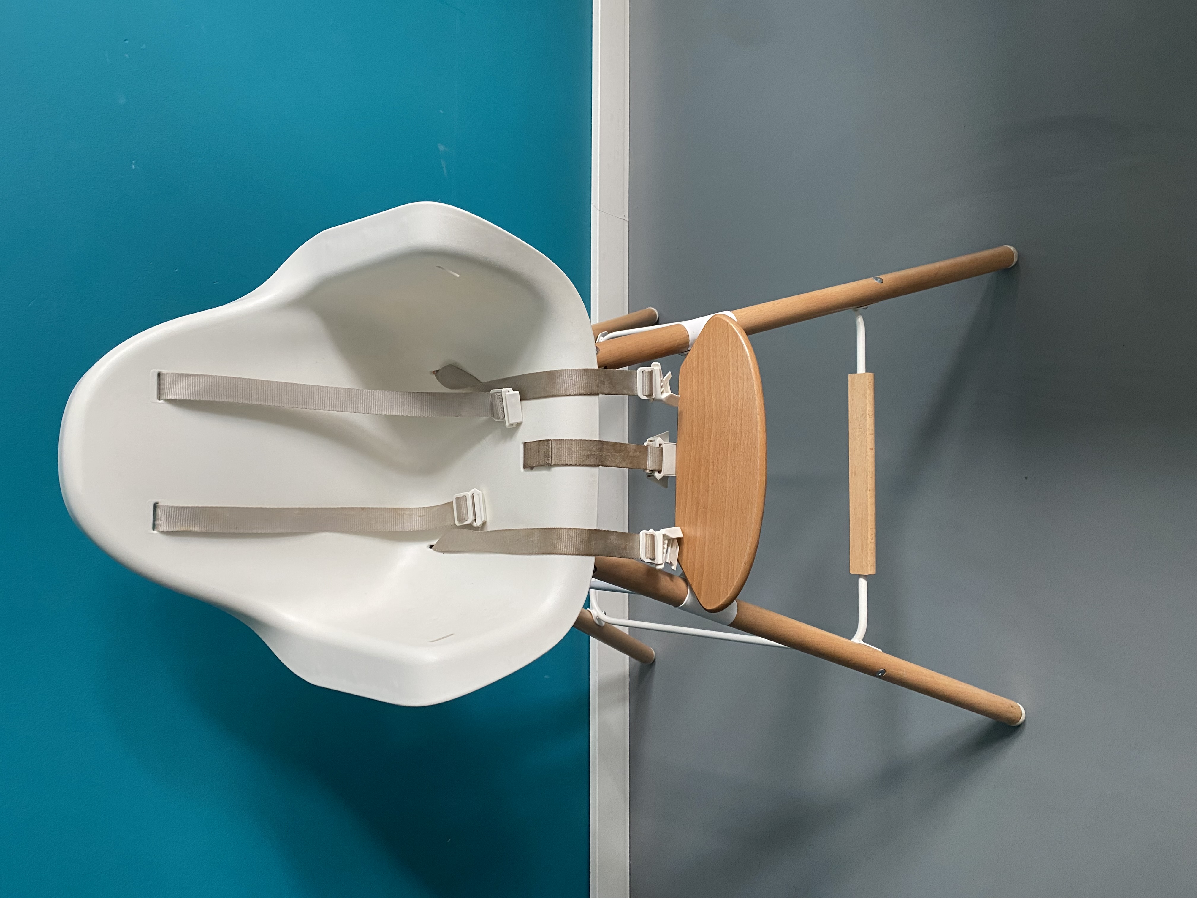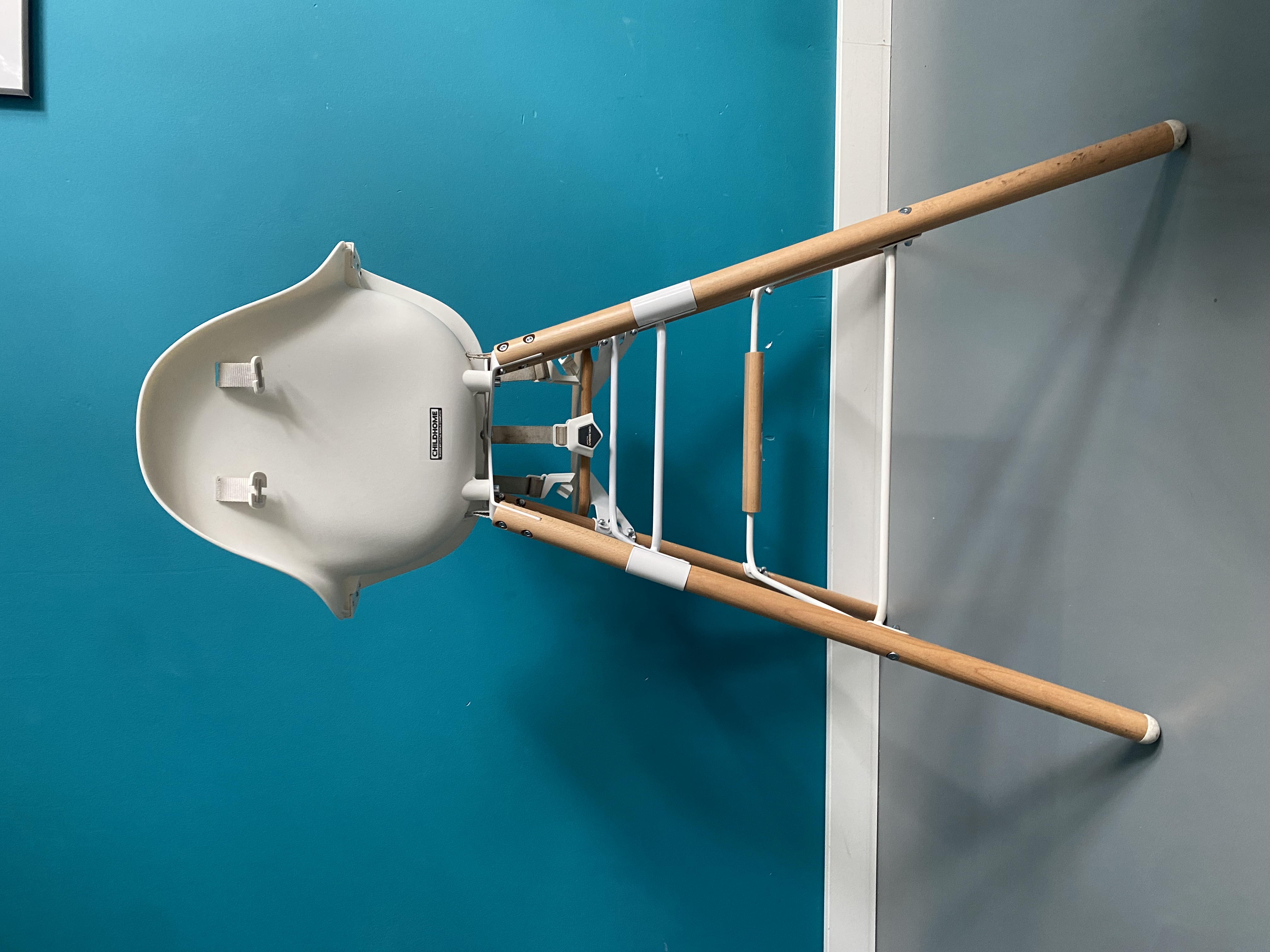 HomeChild high chair in excellent condition. Ideal for higher-than-average tables, it can also be adapted to standard tables thanks to its different-length legs. Sold with a wooden top and cushion.