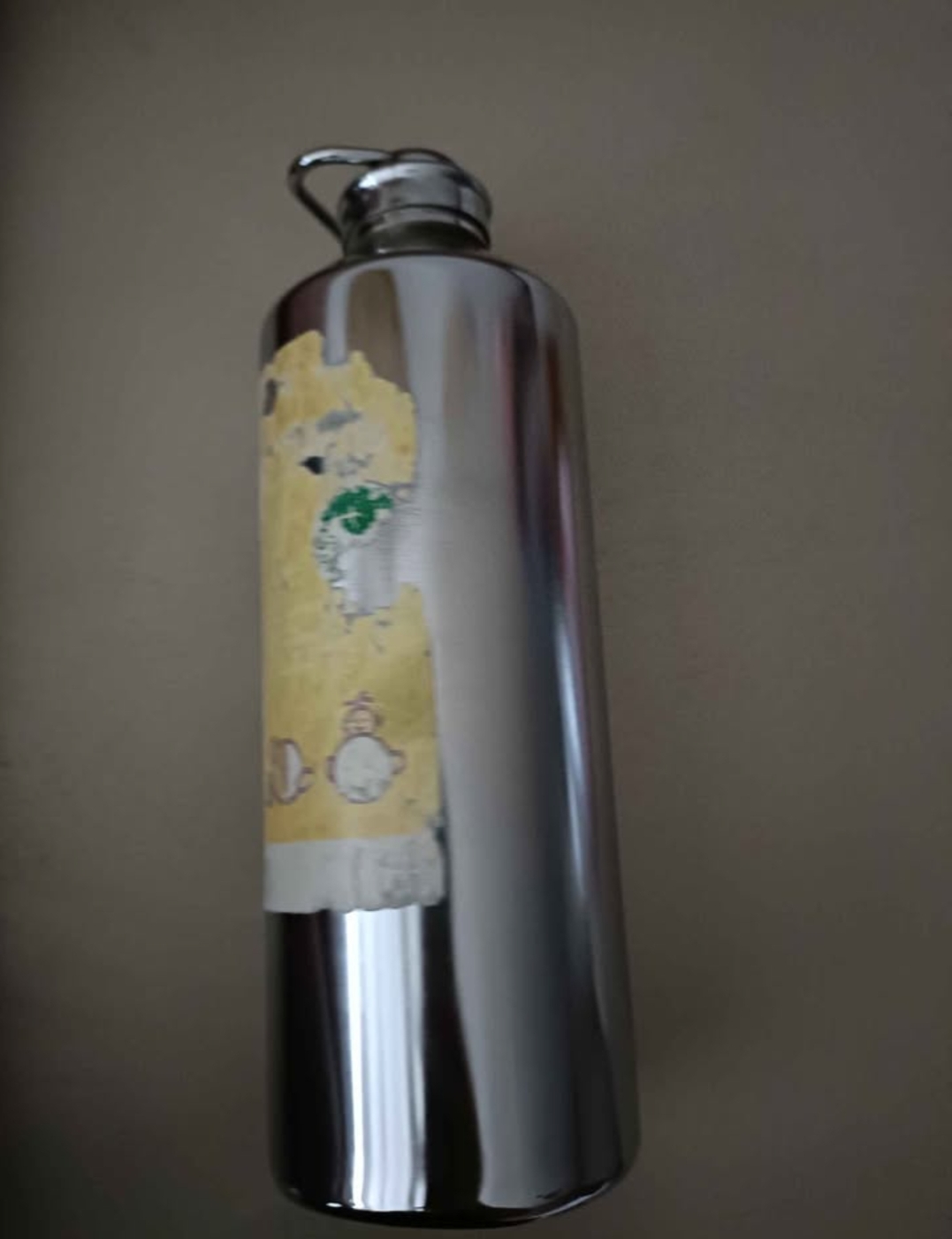 Baby kruik metaal. Onderop zit een bolling. Totaal geen probleem is dit echter moet je opletten met het vullen van de kruik.