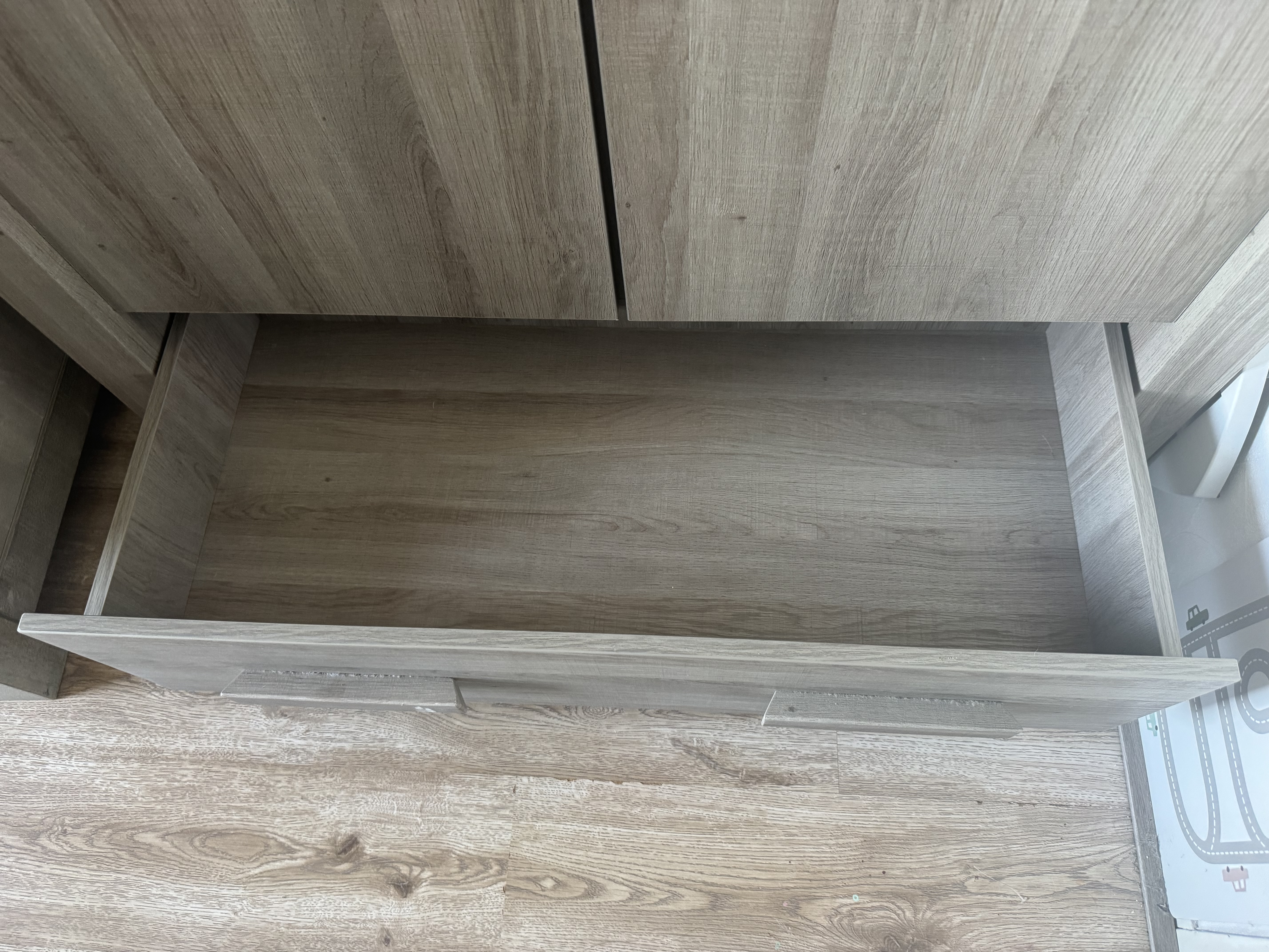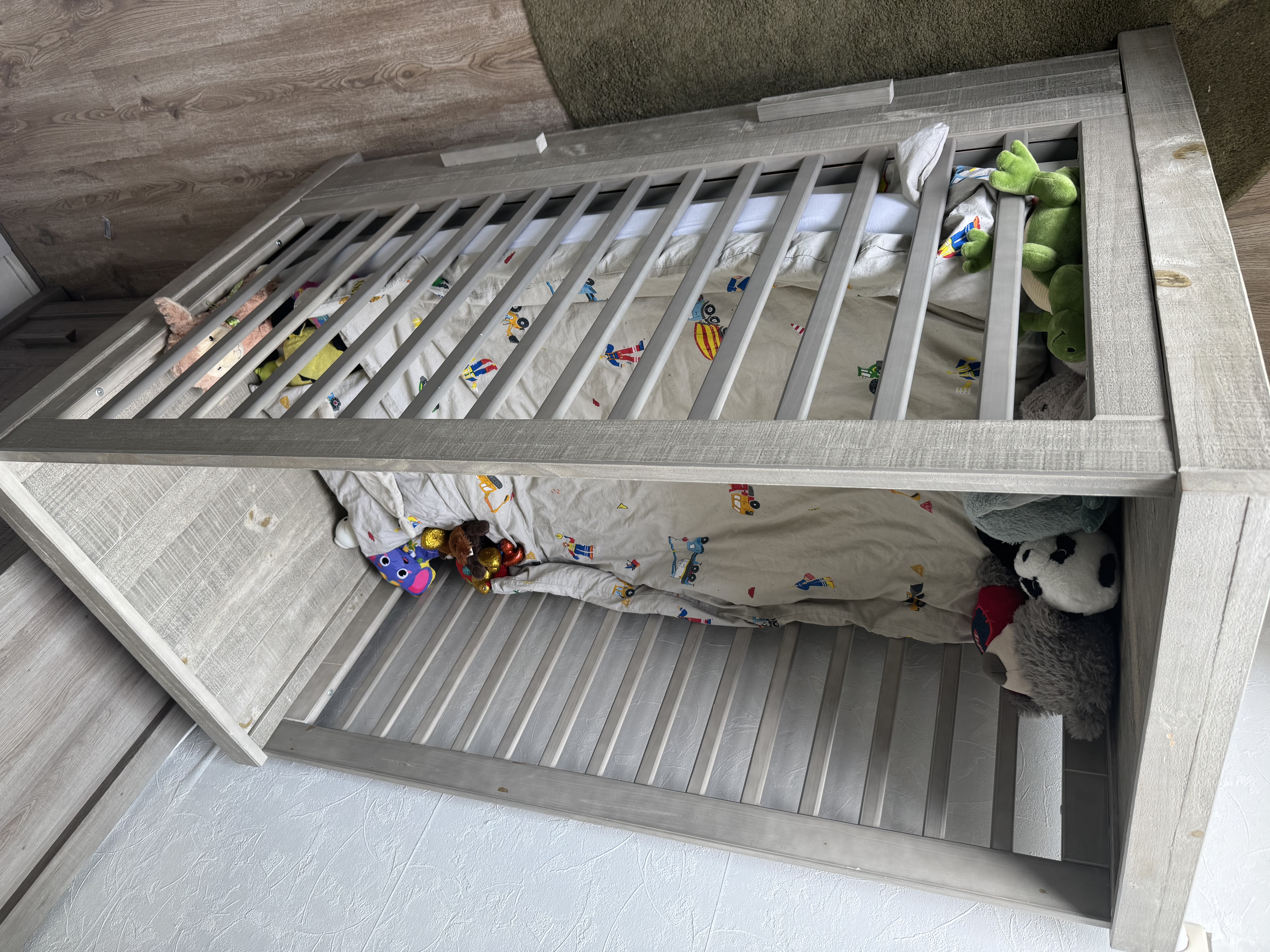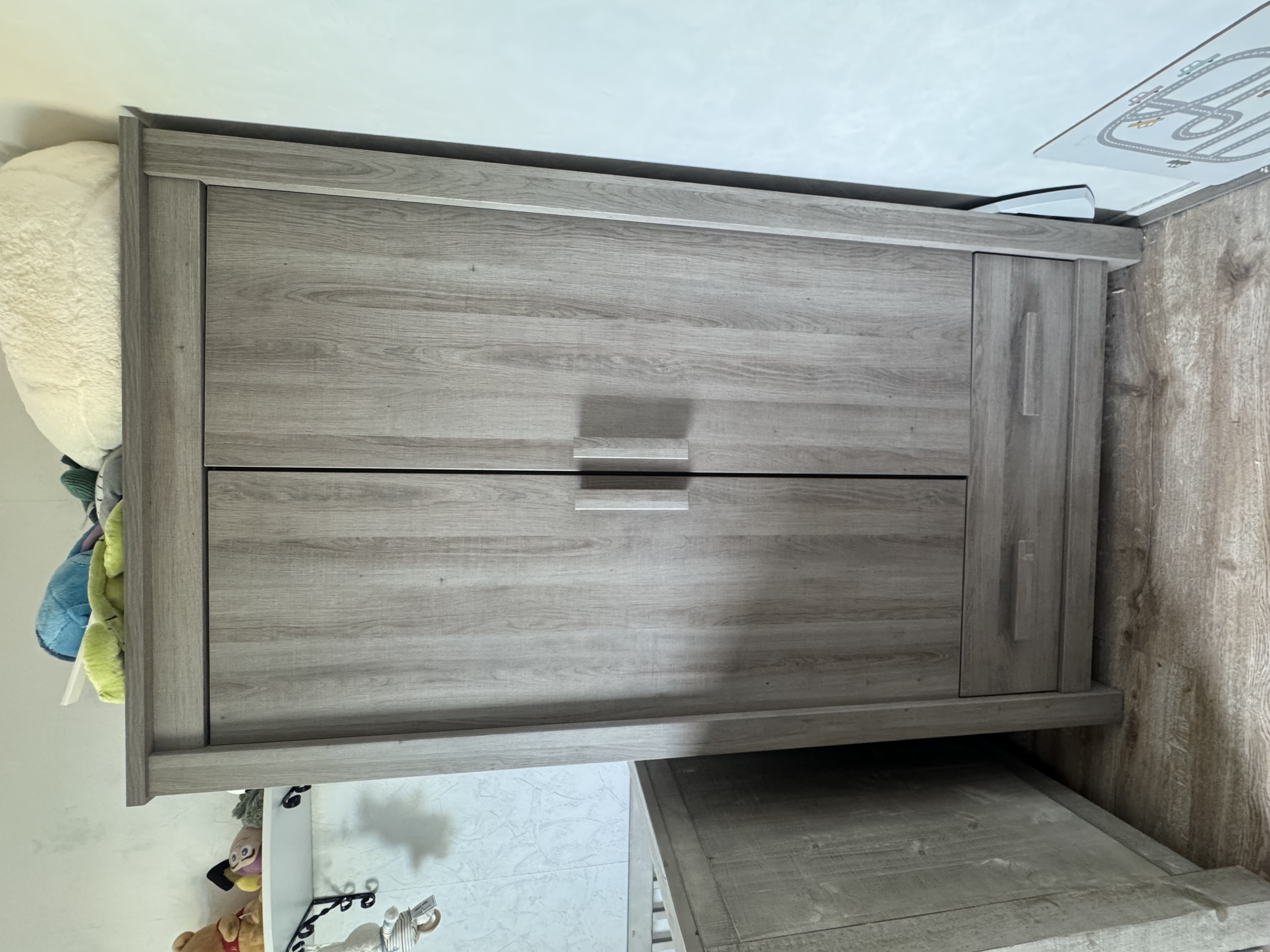 Vanwege dat mijn zoontje uit zijn bedje begint te groeien verkoop ik deze mooie mee groei bed (70x140) met bij passende kast en commode met kussen.