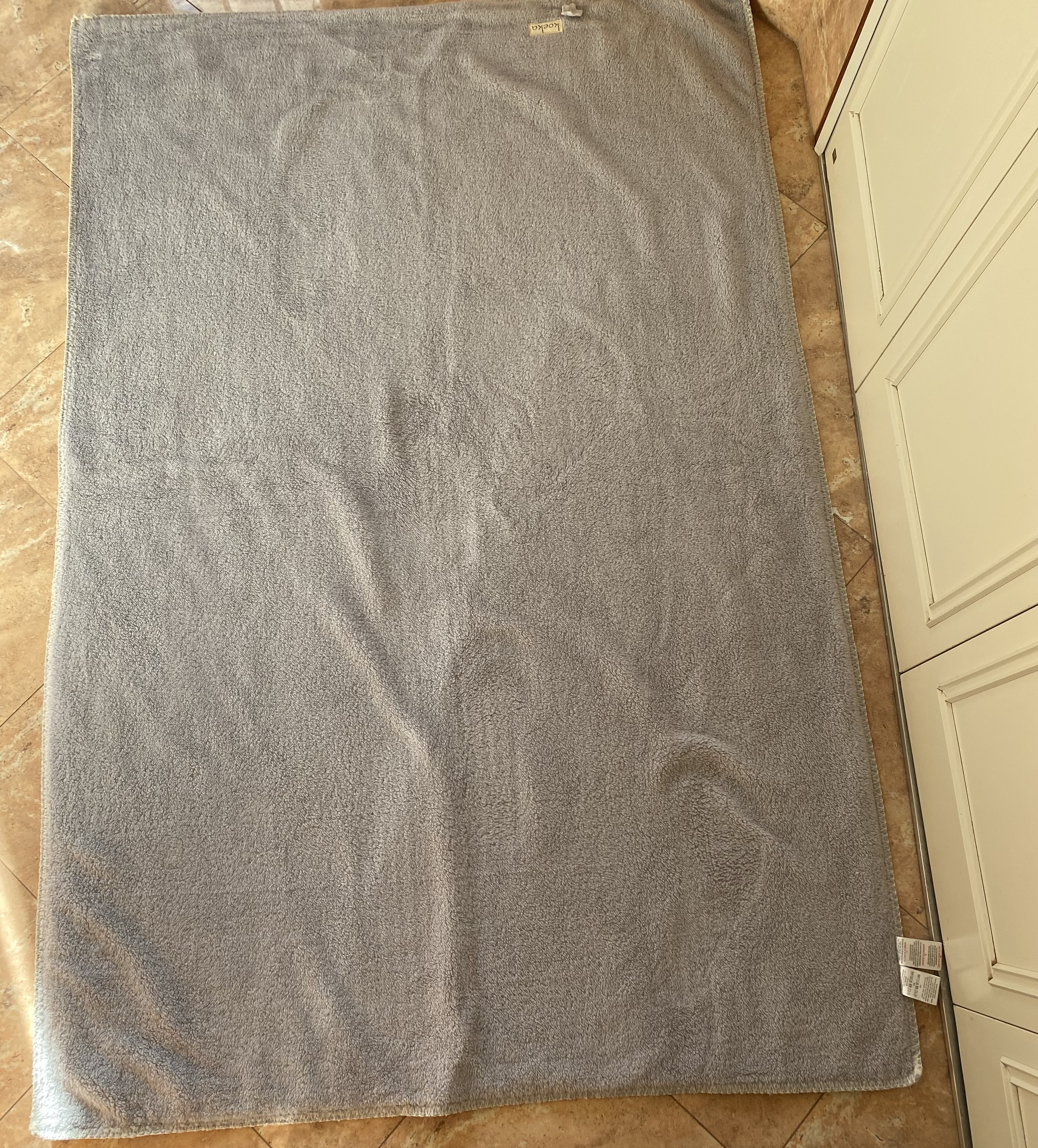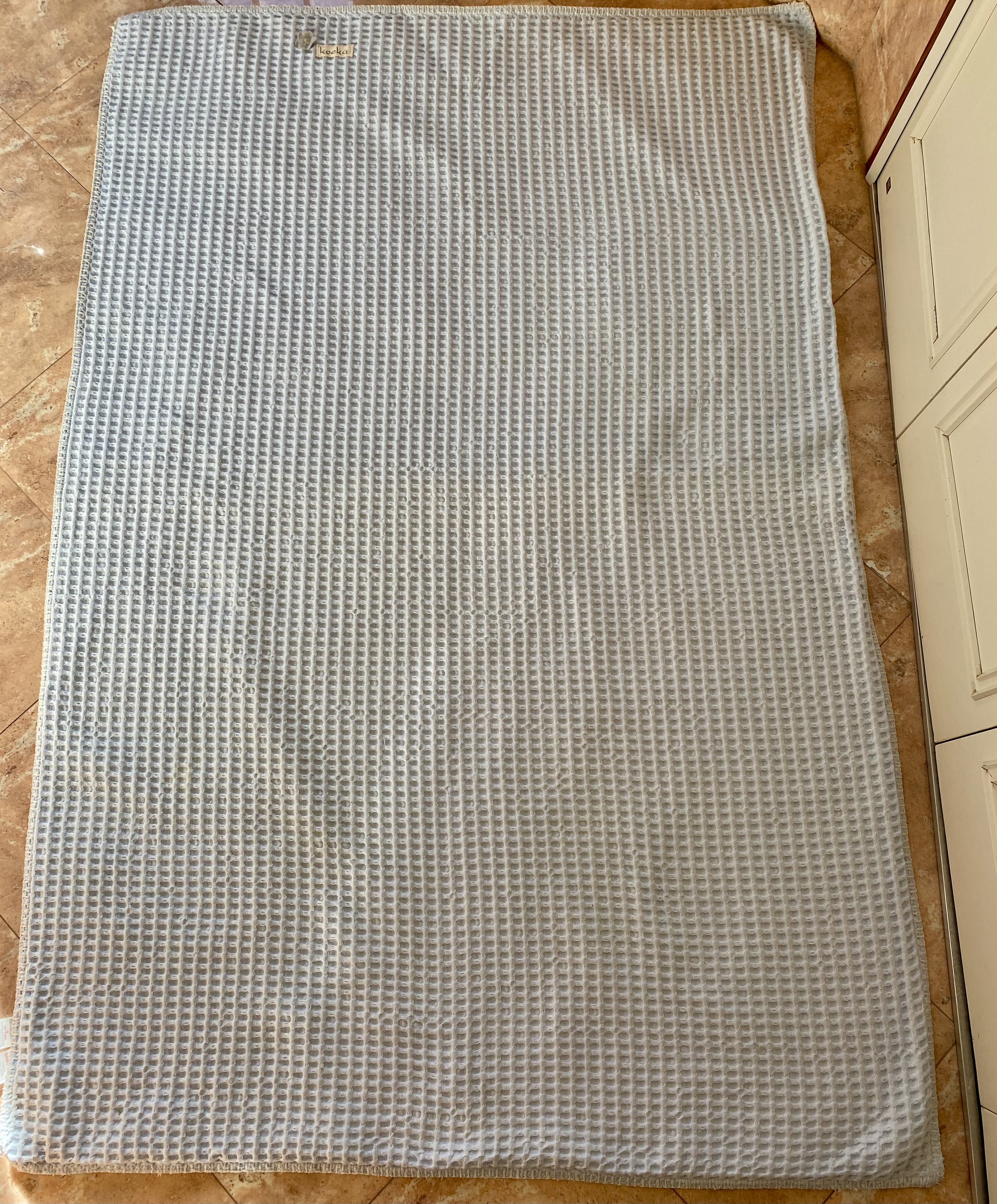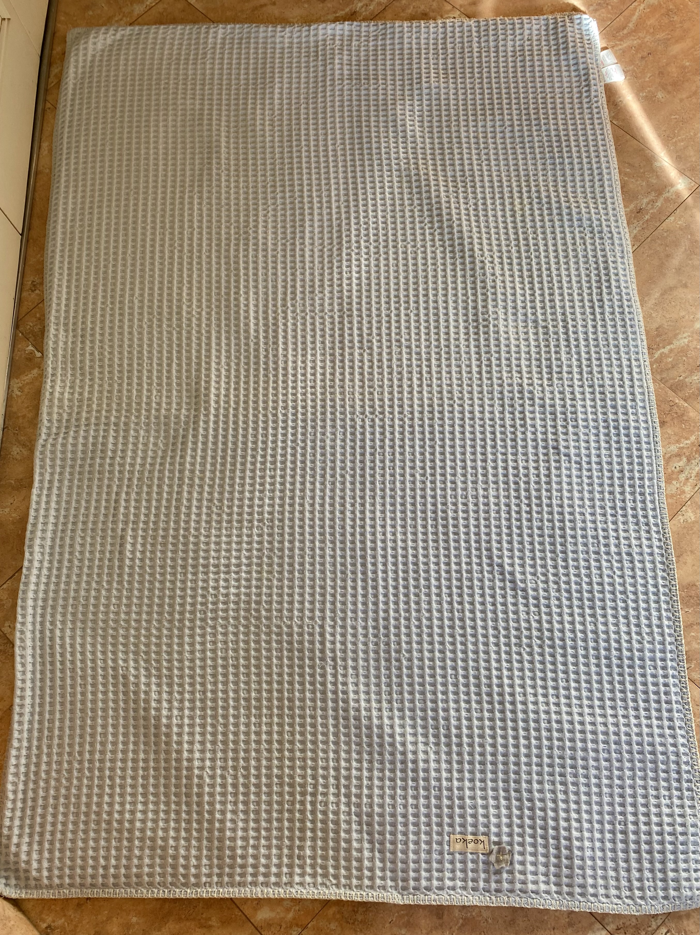 Een kant is lichtblauw met wafeltjes motief. De andere kant is grijs met zachte teddy stof.