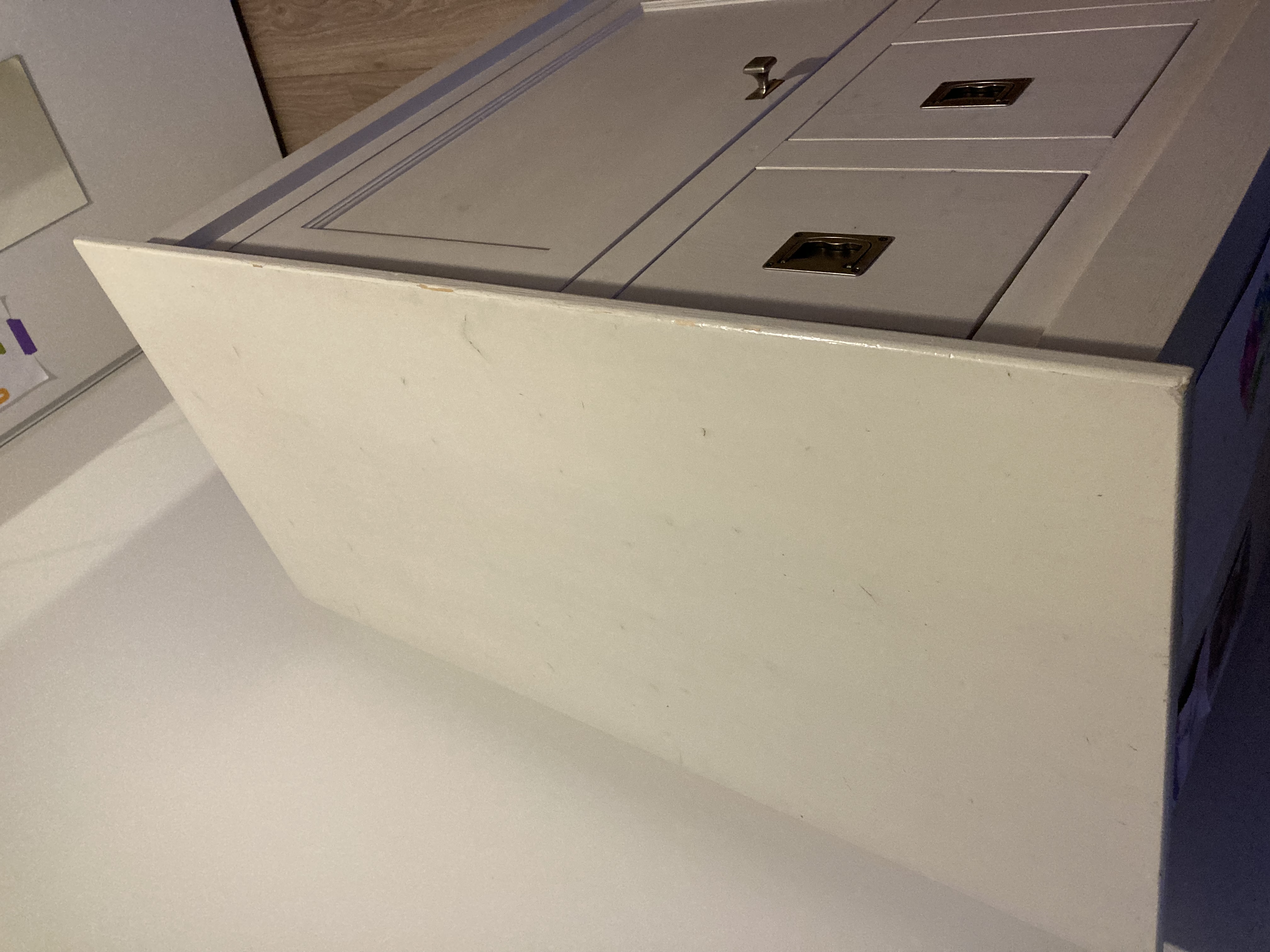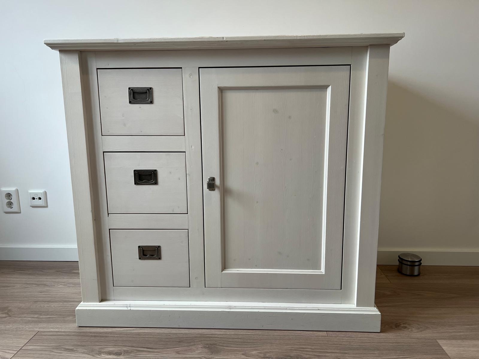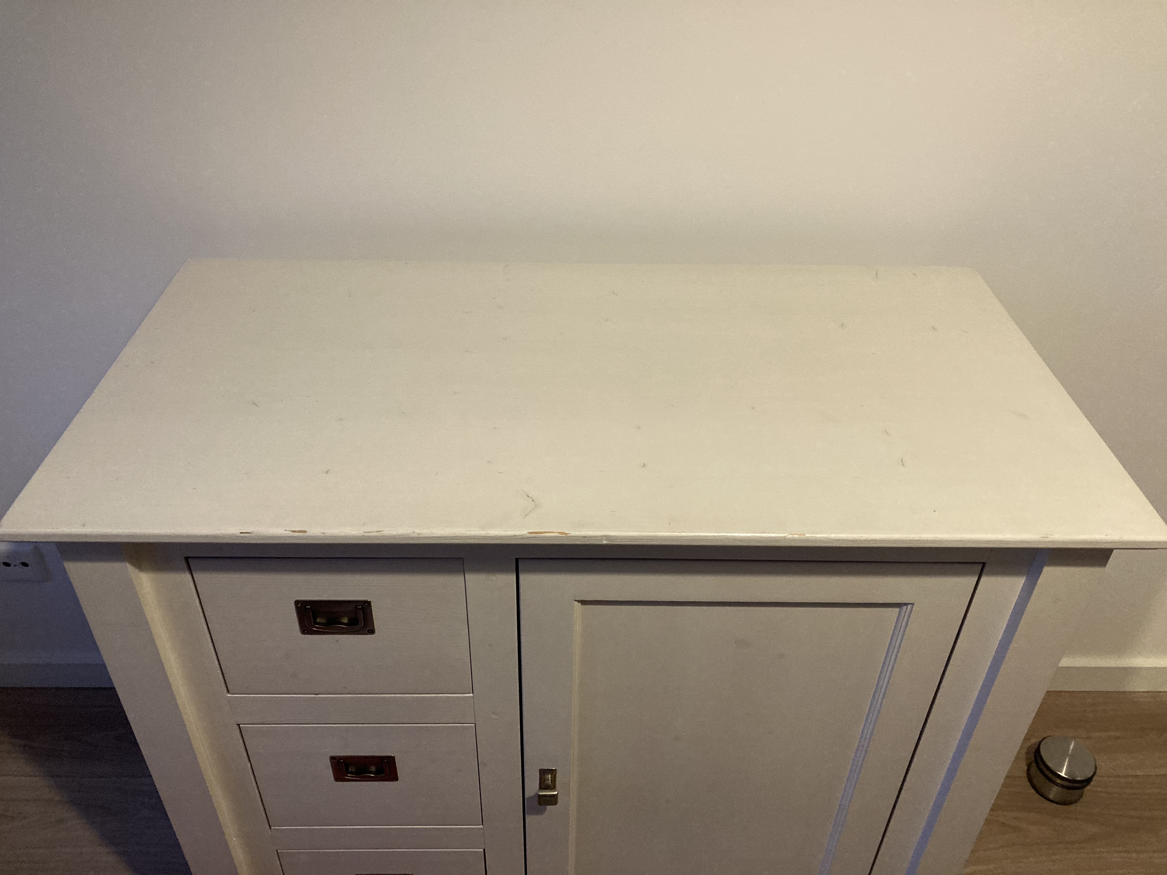 Van de commode is aan de rand bovenaan een beetje verf af (zie foto) maar dit is makkelijk bij te werken met white wash verf. Verder is deze nog heel netjes. Afmetingen commode: 93 (h) x 103 (b) x 52 (d) cm.