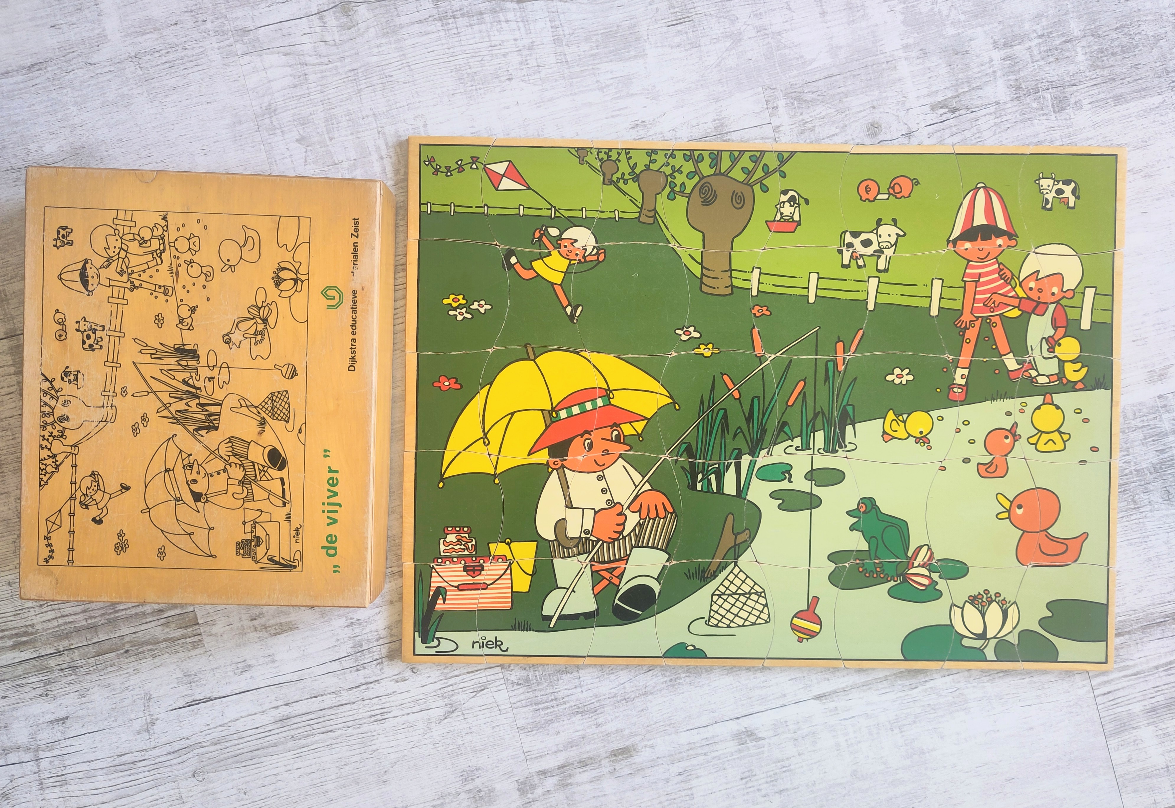 Grote vintage houten puzzel "de vijver" van Dijkstra educatieve materialen Zeist, bekend van de oude schoolplaten. Geïllustreerd door Niek (die ook voor Educo tekende) en komt in een stevige houten kist met daarop het voorbeeld als opdruk.
