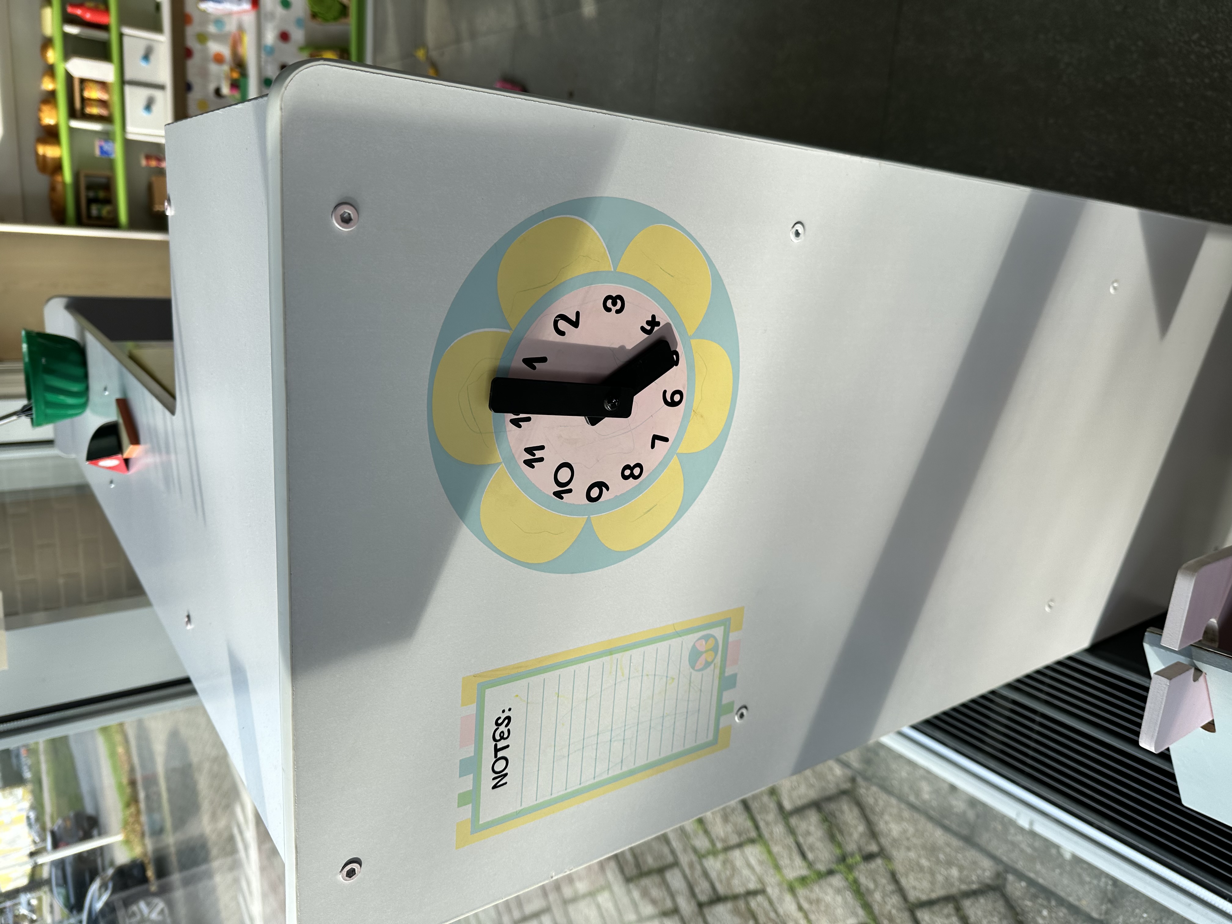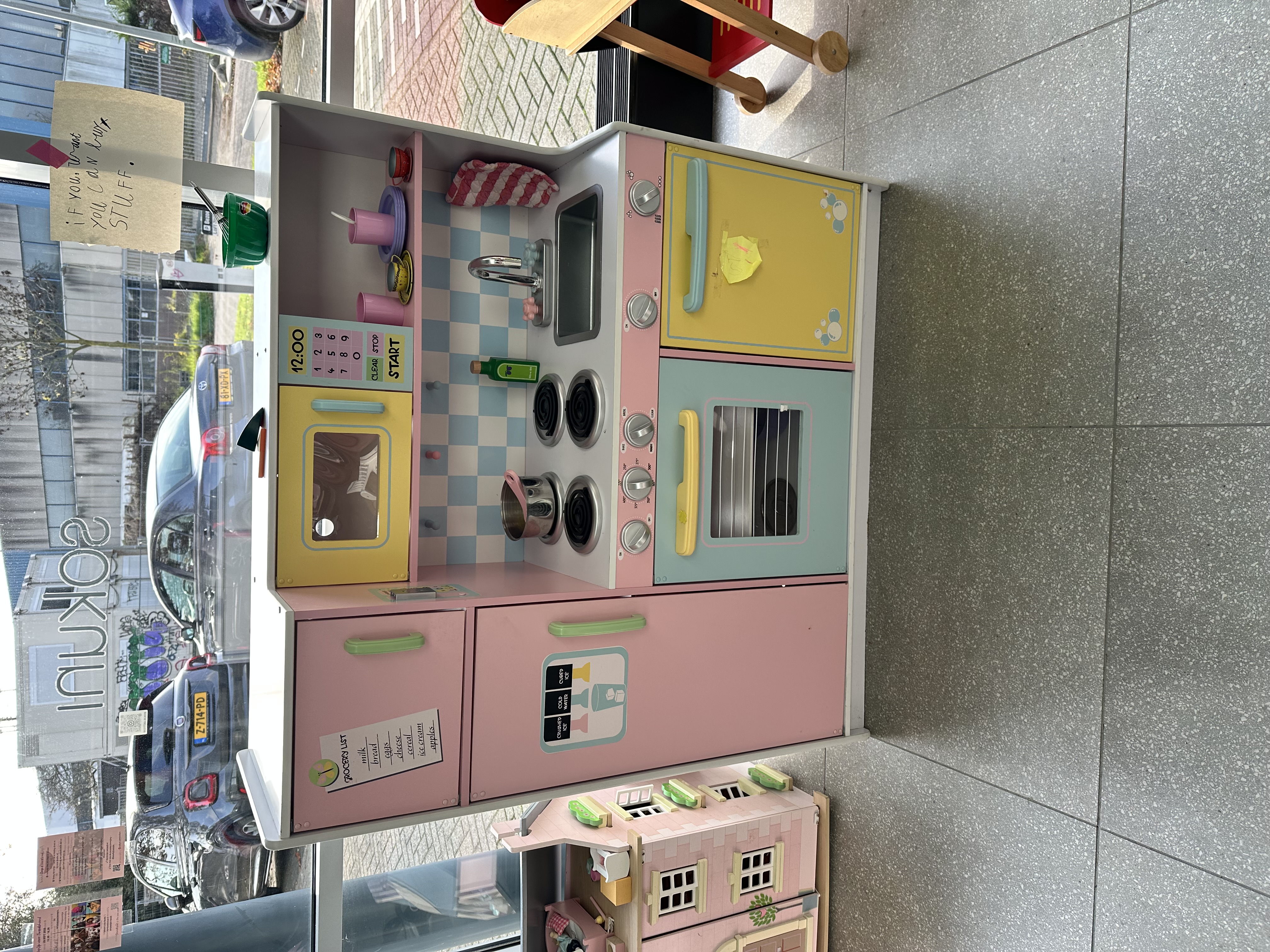 Beautiful Play kitchen from wood. Brand KidKraft. It's sturdy (doesn't tip over), has beautiful muted and colourful colours, lots of shelfs and room. Check the pics. The phone is missing. New price is 249 > check on lobbes