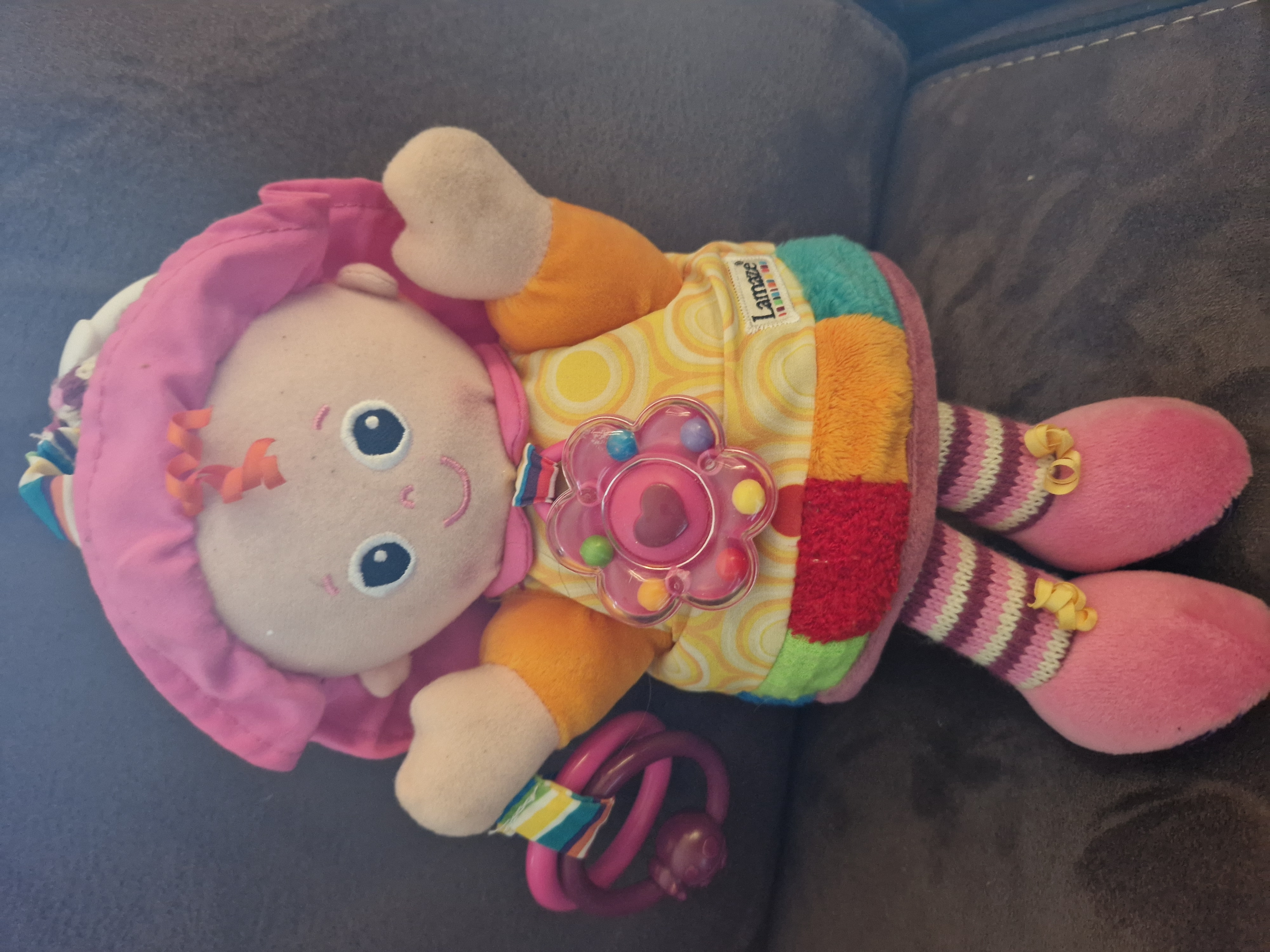 De knuffel op de afbeelding is de Lamaze Mijn Vriendin Emily pop.