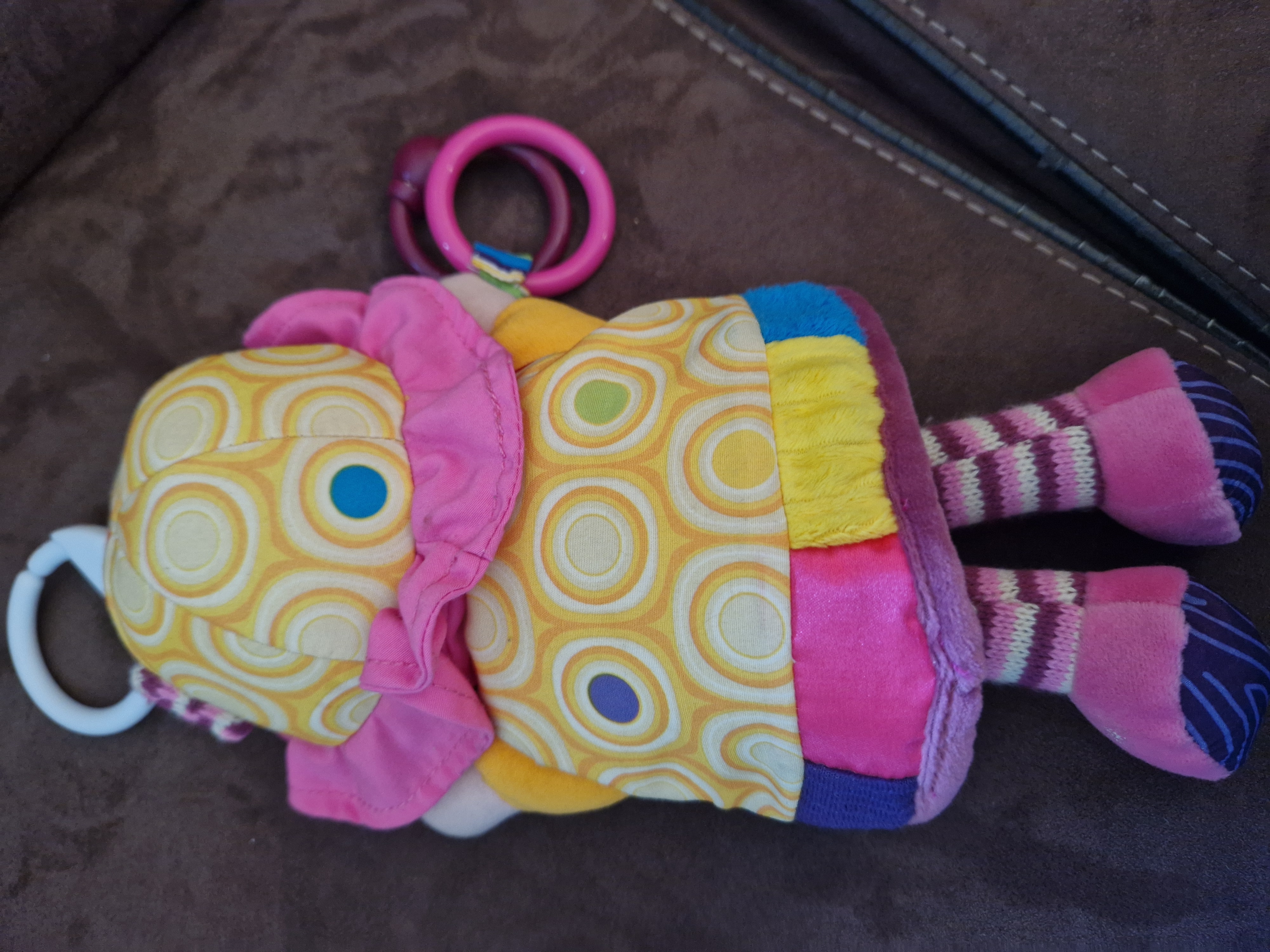 De pop kan aan een kinderwagen of babygym worden bevestigd met een Lamaze-link.