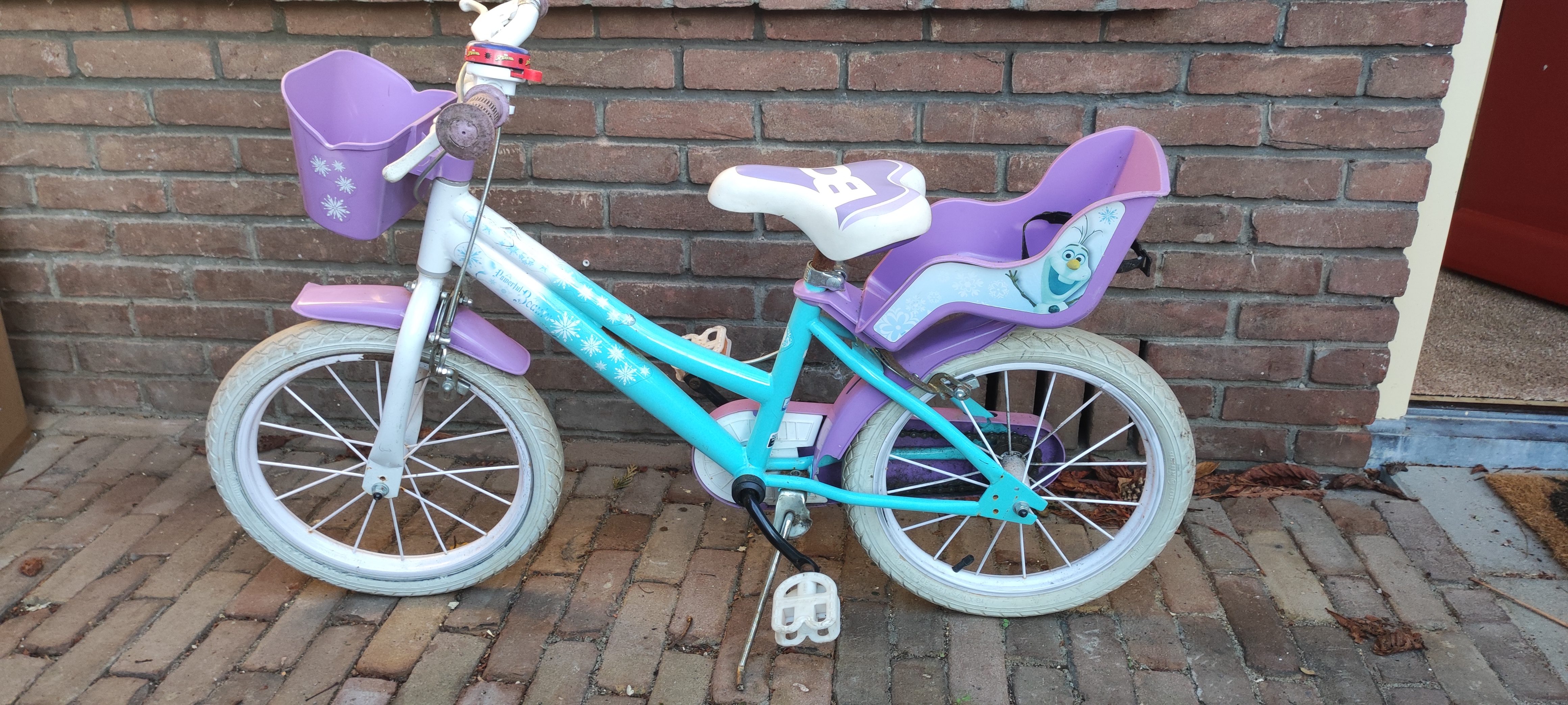 Frozen kinderfiets 16 inch wielen, leeftijd vanaf 3 tot 5 jaar (afhankelijk van de lengte van je kind).
