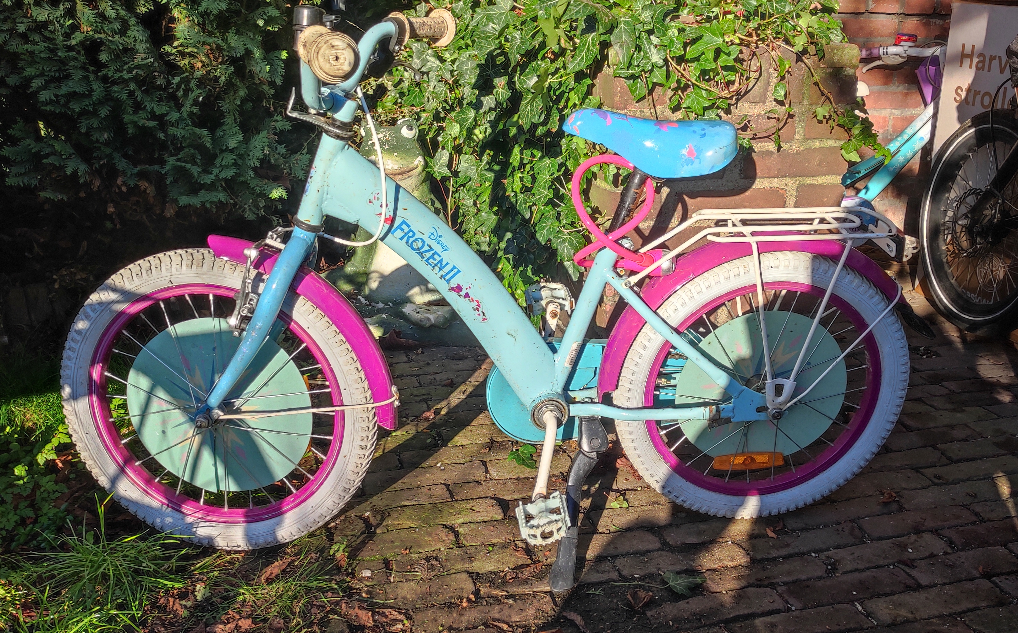 Fiets is technische helemaal in orde en heeft een stabiele standaard. Handvatten niet helemaal wit meer maar deze zijn te vervangen. Voorop is eenvoudig een mandje te monteren. Een nieuwe is los verkrijgbaar. Zijwieltjes krijg je er wel bij van mij.