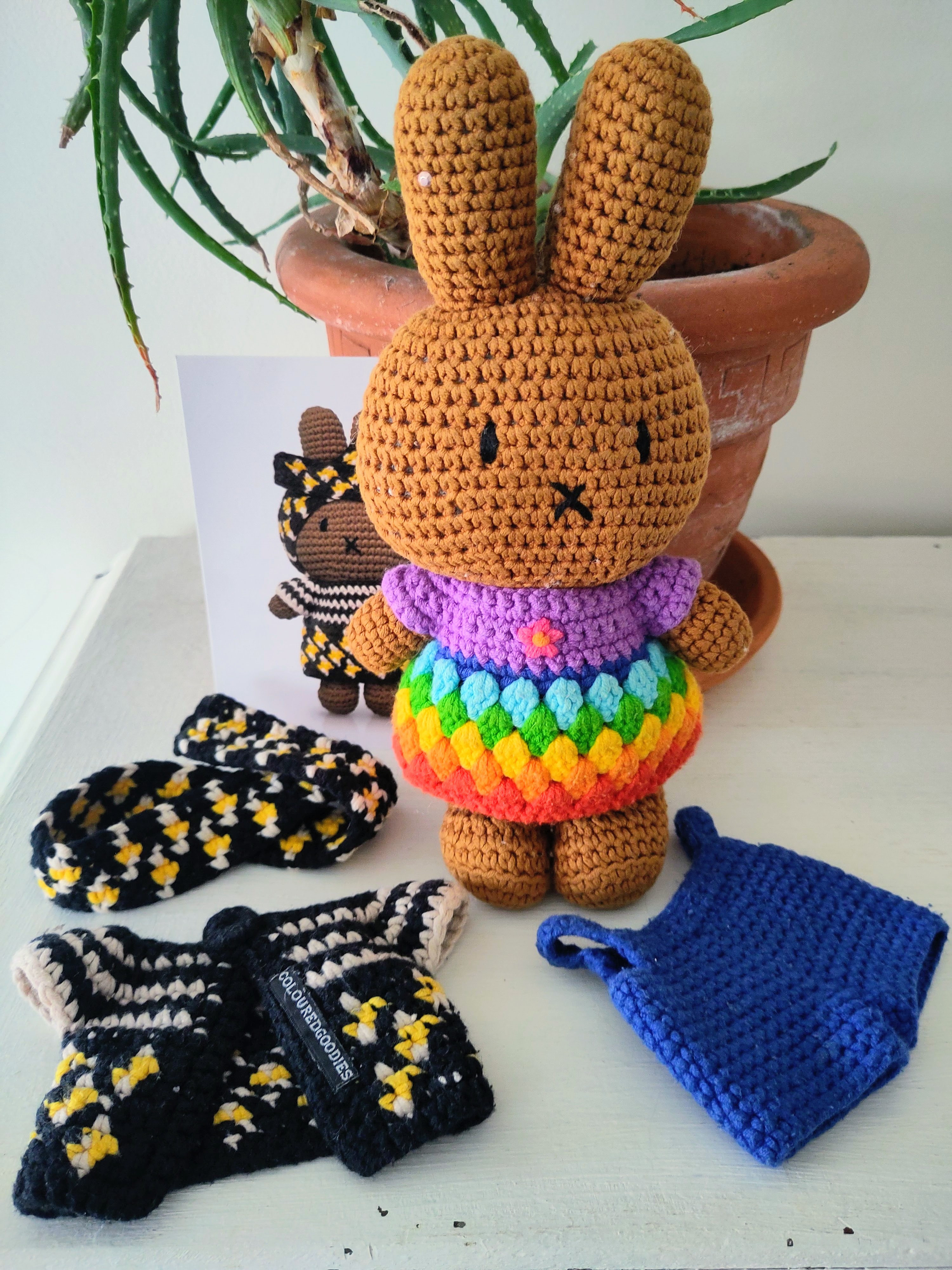 Gehaakte knuffel van Nijntje's bruine vriendin Nina / Melanie. Komt met 3 outfits: een regenboog jurk, een Surinaamse outfit met hoofdband en een blauwe jumpsuit. Een fijn inclusief cadeau voor meer diversiteit!