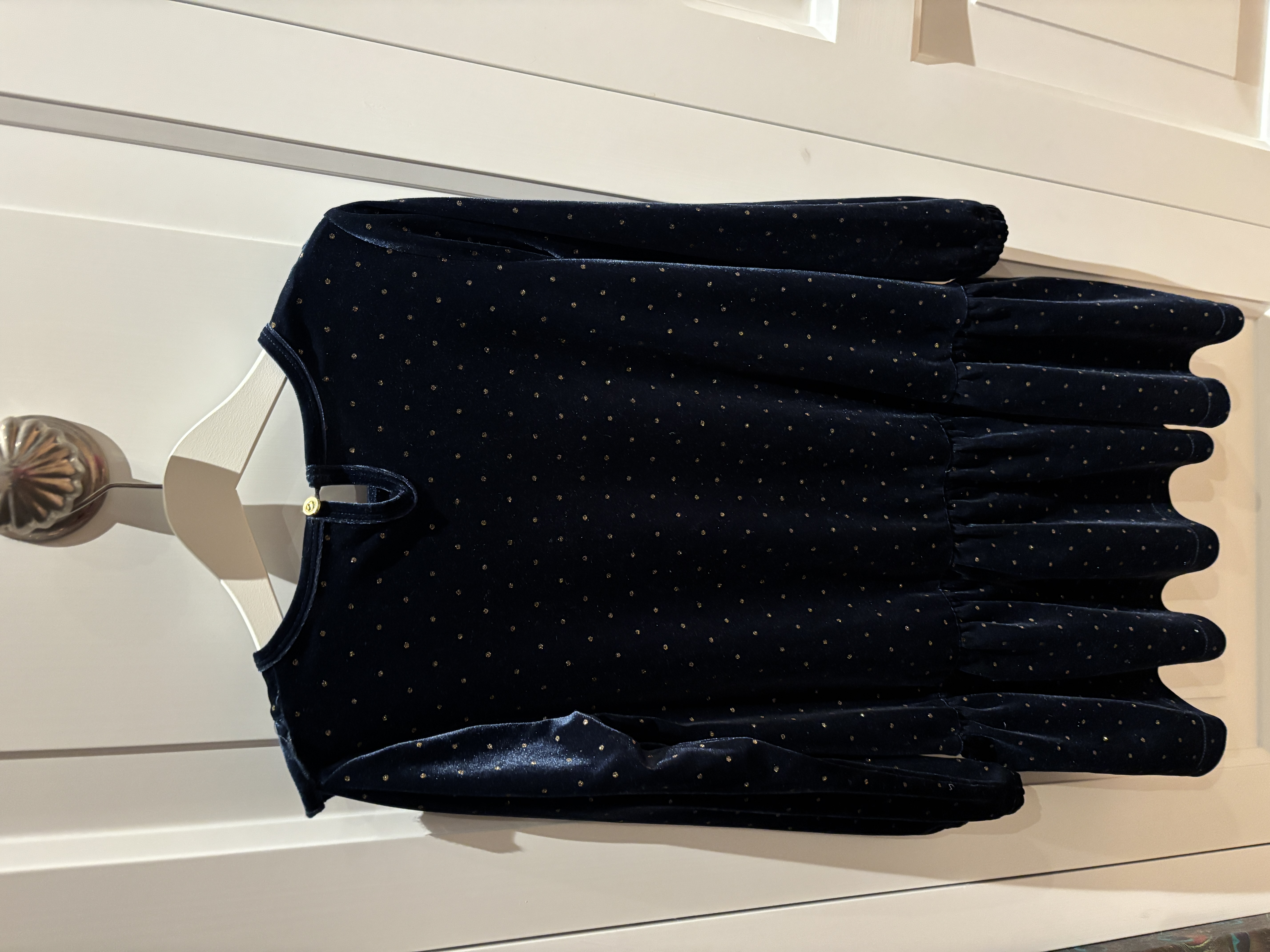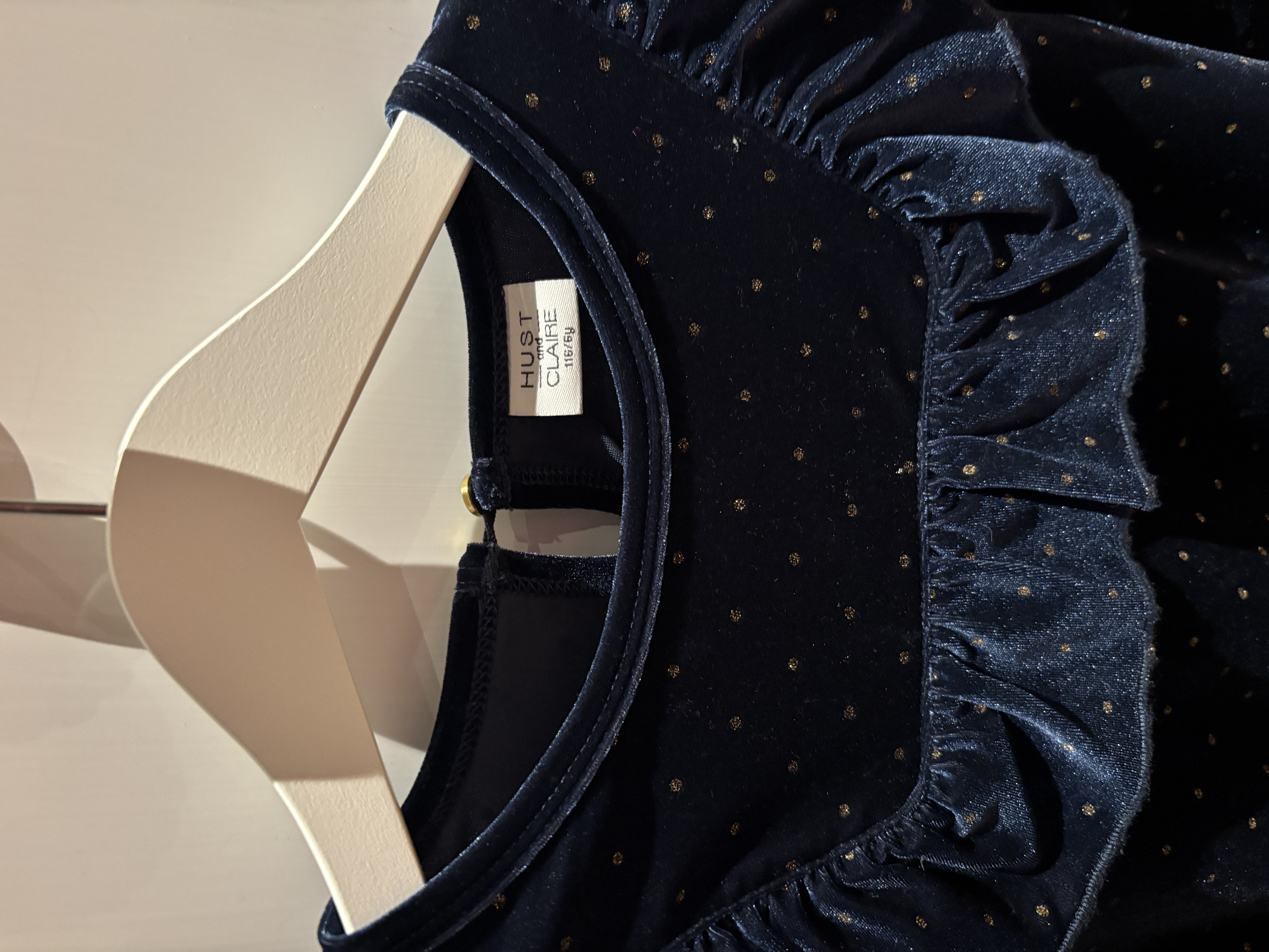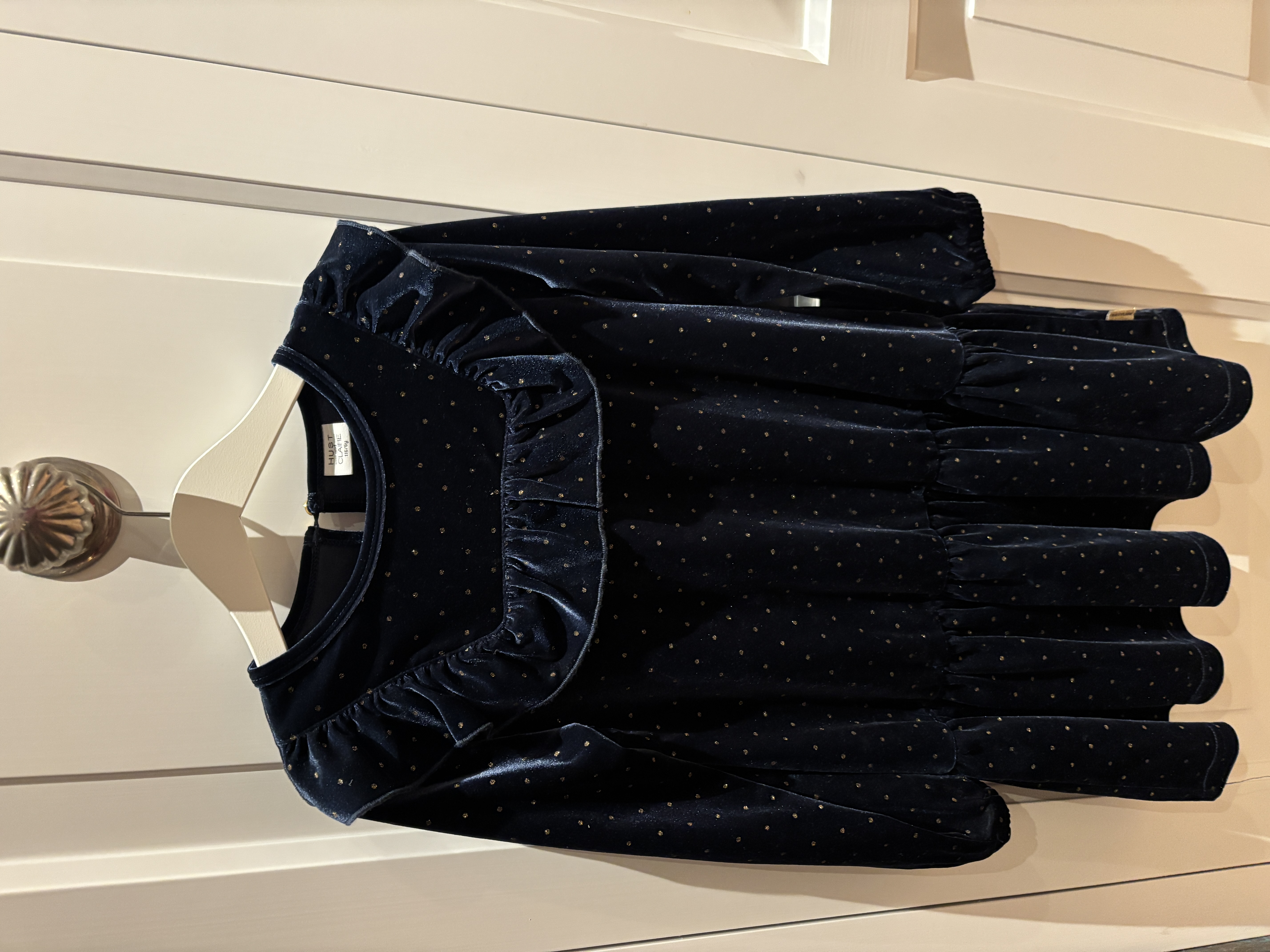 Mooie donkerblauwe fluwelen jurk met gouden stipjes en volant. Lange mouwen, sluiting achter met knoopje.