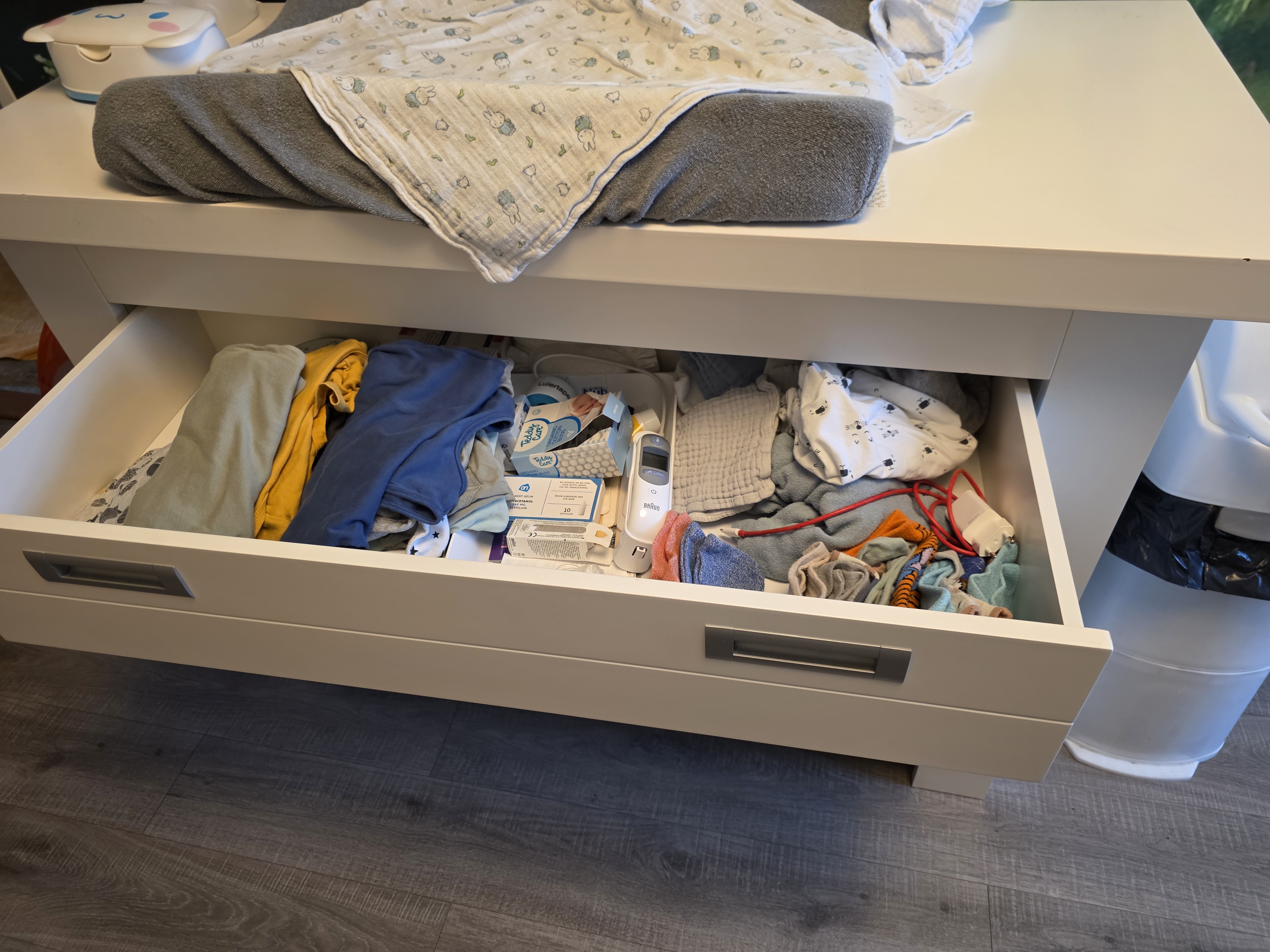 Uiteraard verkoop ik deze zonder de spullen die er op staan of erin liggen. Dus puur de commode en kast zelf. De commode heeft 3 lades en de kast heeft aan beide kanten bovenin een plank en daaronder een stang en een plank.