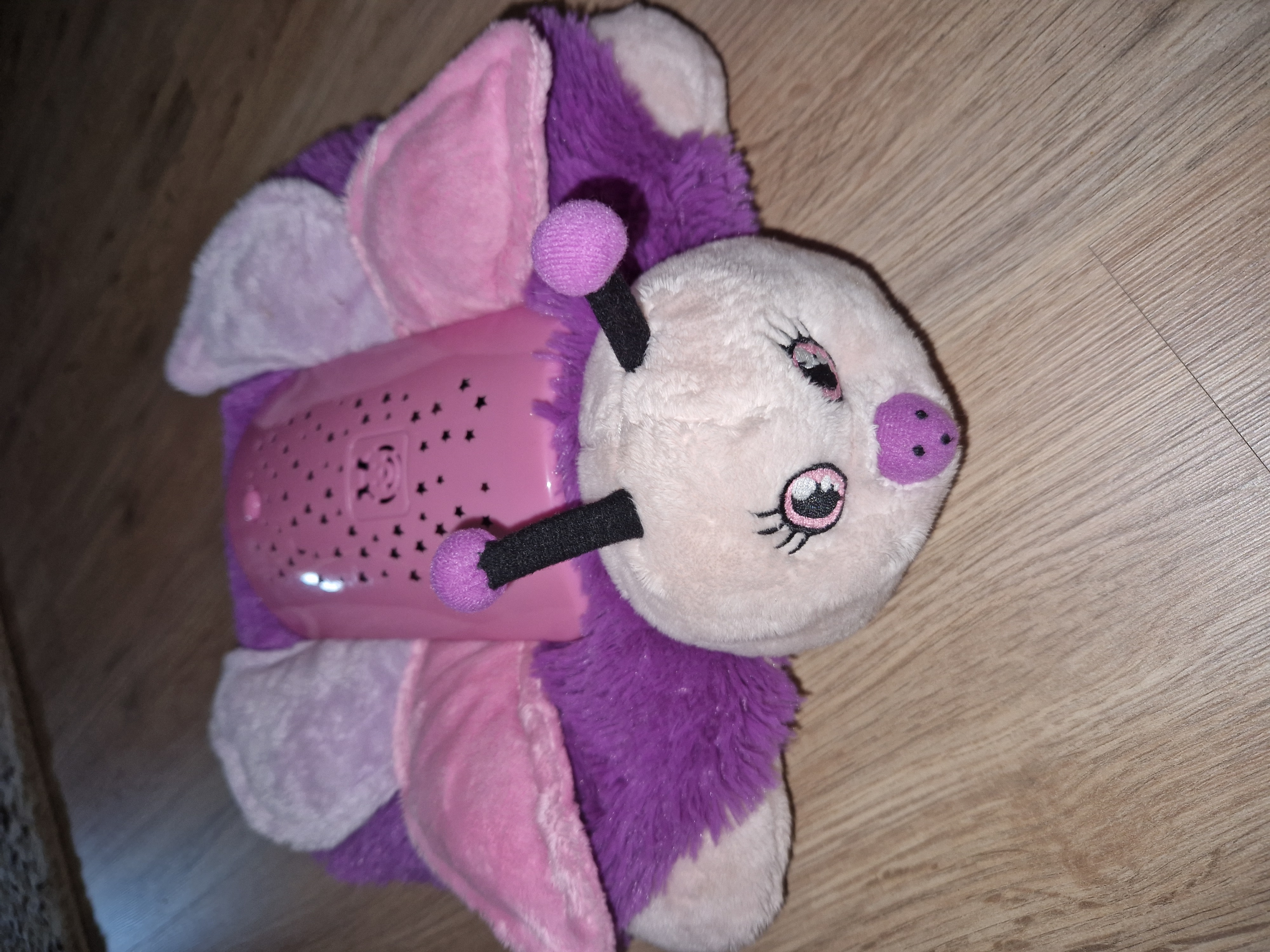 Dit product is een Pillow Pets Dream Lites nachtlampje in de vorm van een roze en paarse vlinder, ook wel bekend als "Mrs. Butterfly".