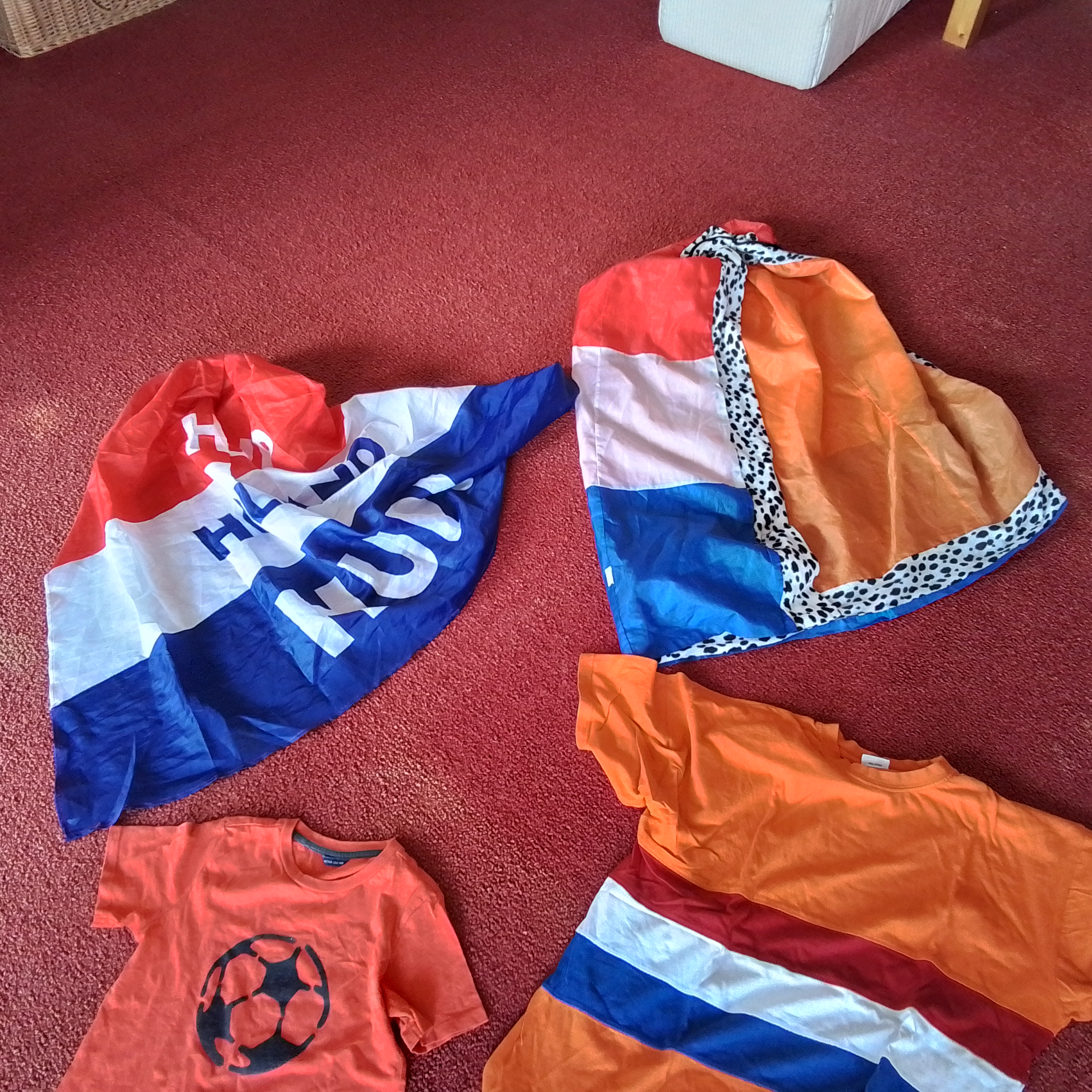 Een oranje, rood, wit, blauw t shirt. Een in maat XL en 1 in maat L. 2.50 euro per stuk.