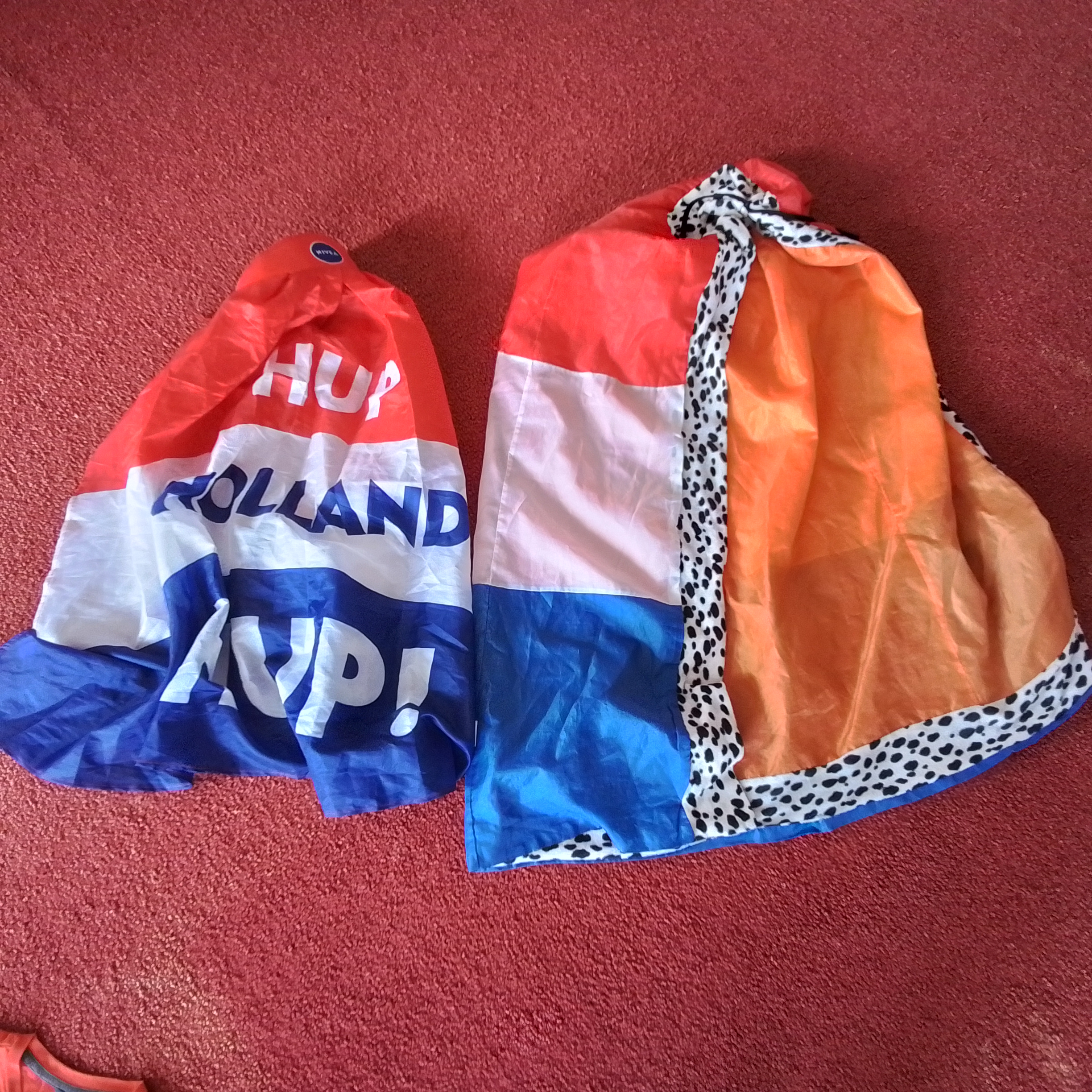 Een oranje cape en de andere kant is rood, wit, blauw. 2,50 euro