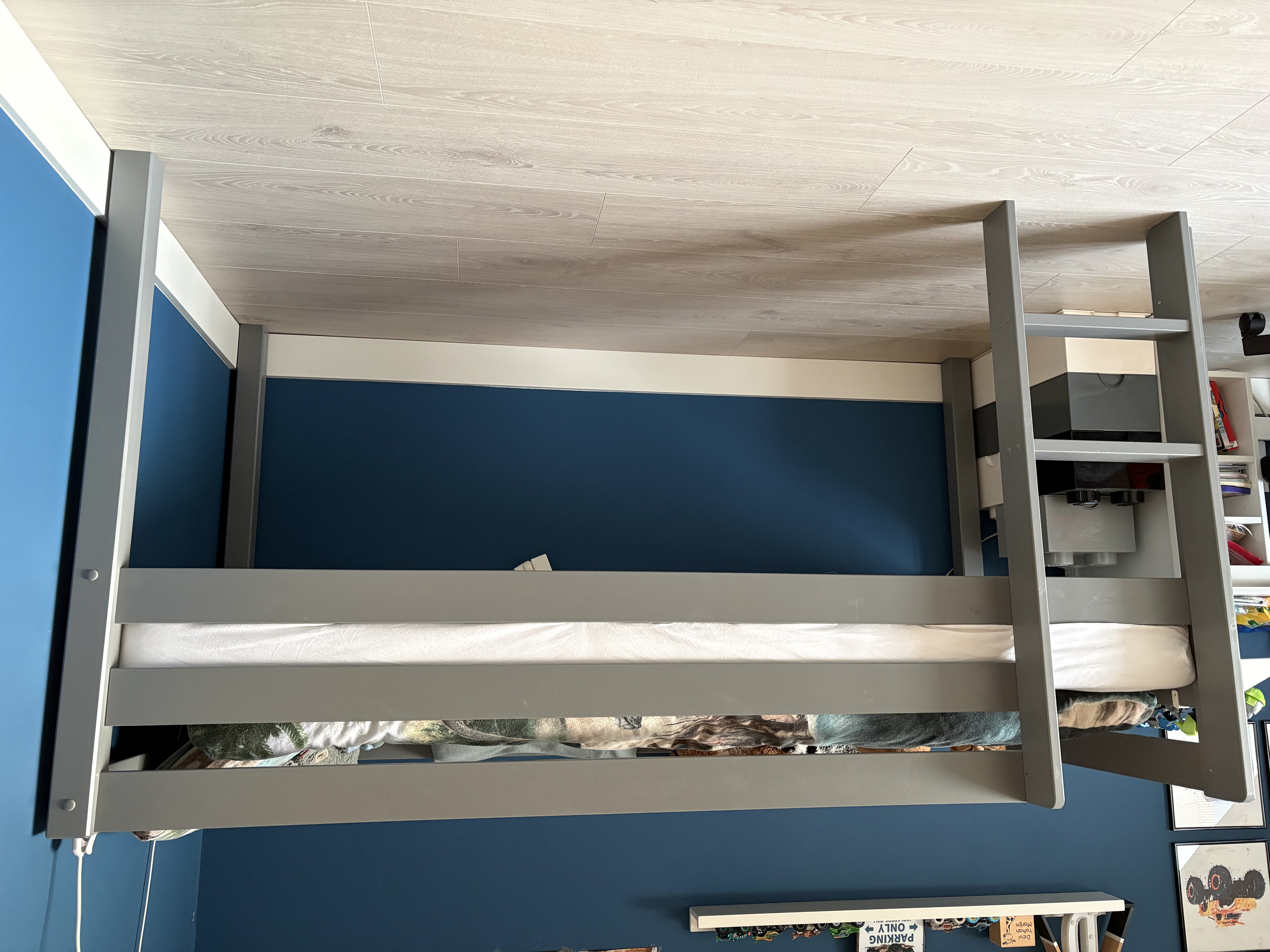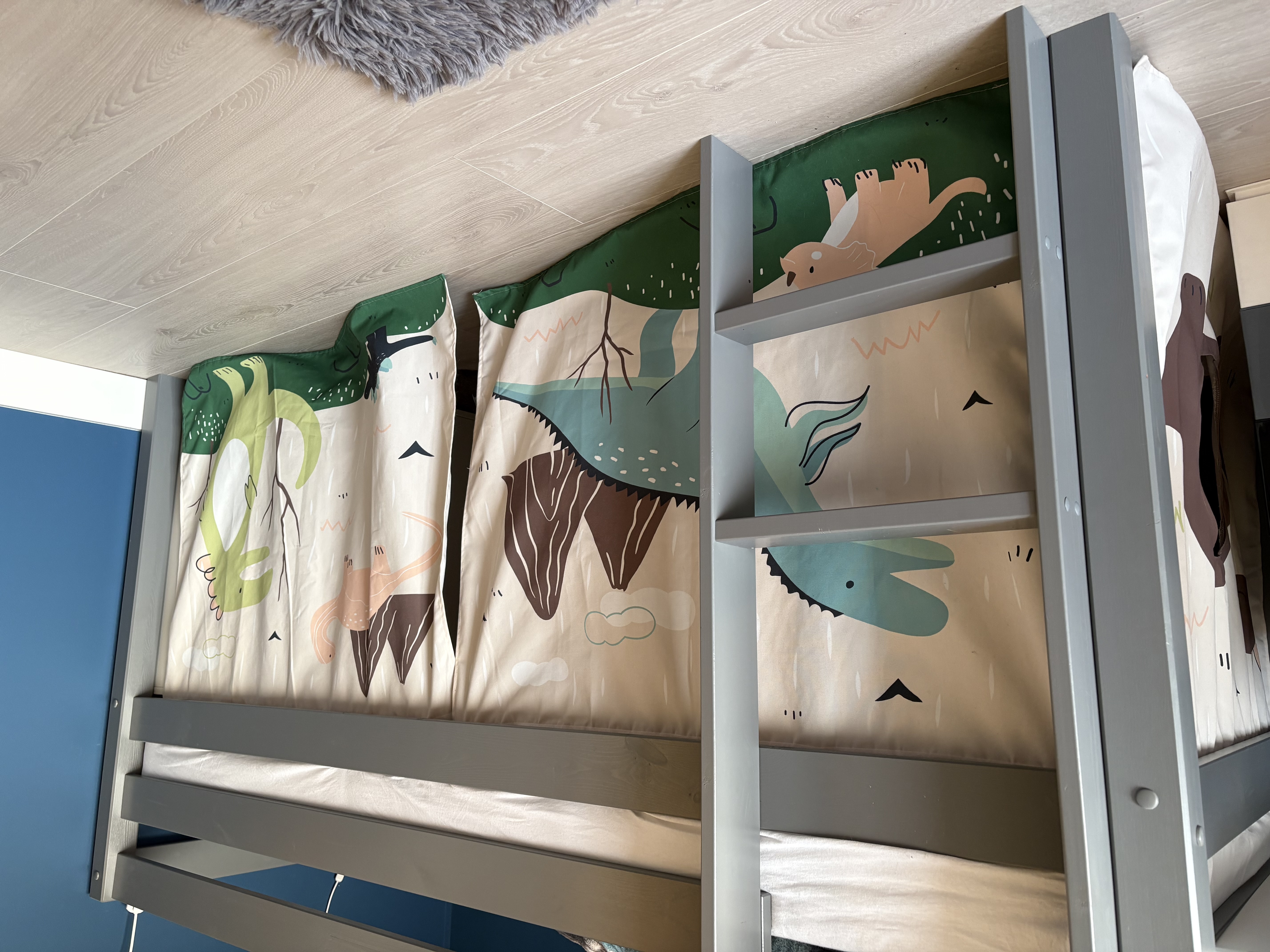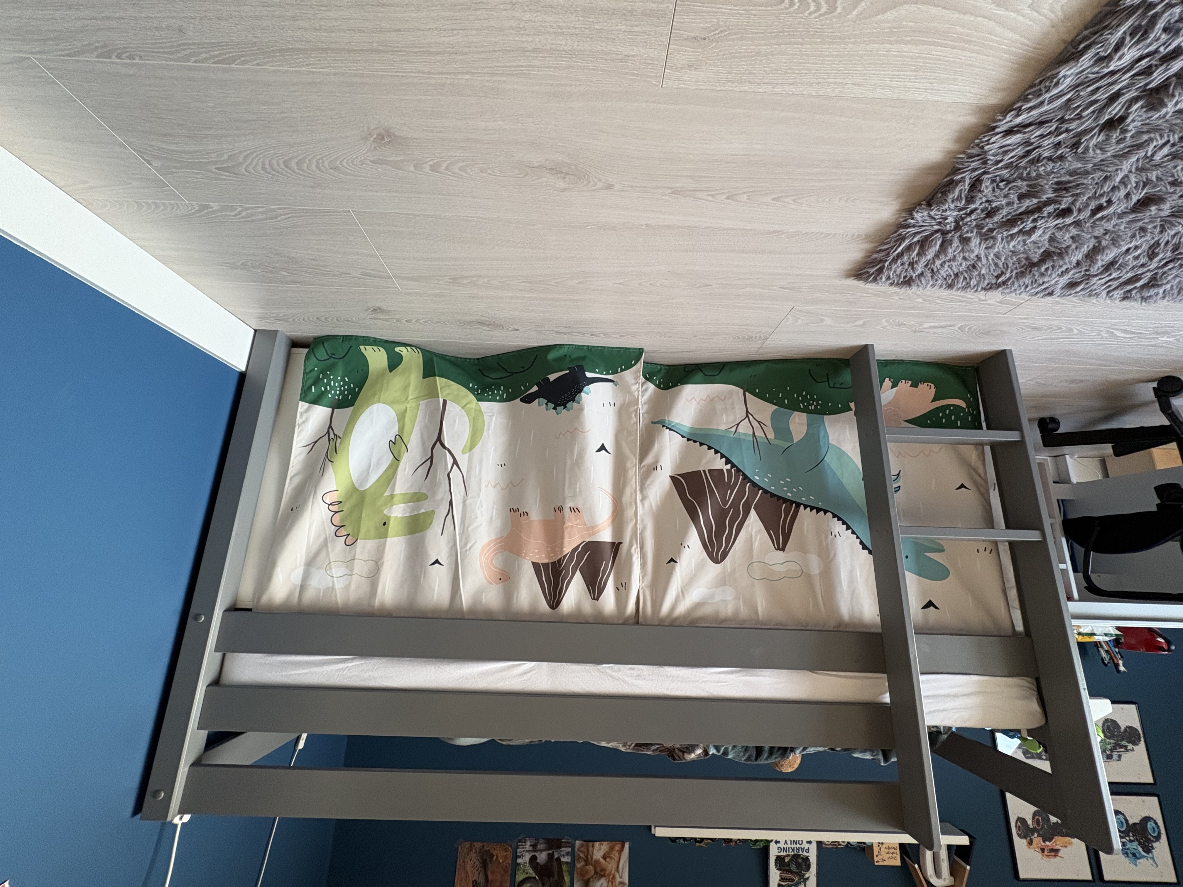 Vipack Pino half hoogslaper in grijze kleur. Ideaal voor kinderen die een leuke slaapplek zoeken. De half hoogslaper biedt ruimte om te spelen onder het bed. In goede staat. Inclusief de dino gordijnen. Exclusief matras (90x200). Lengte: 209,5 cm, Breedte: 105,4 cm, Hoogte: 114 cm.