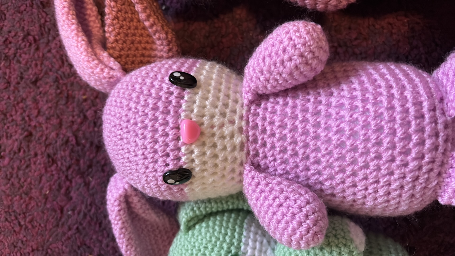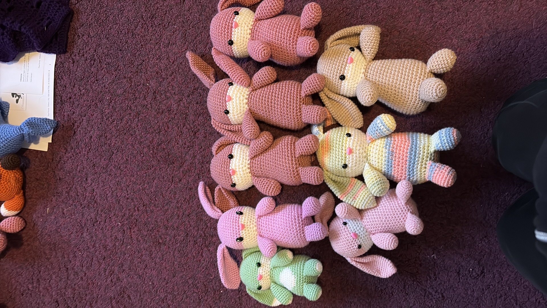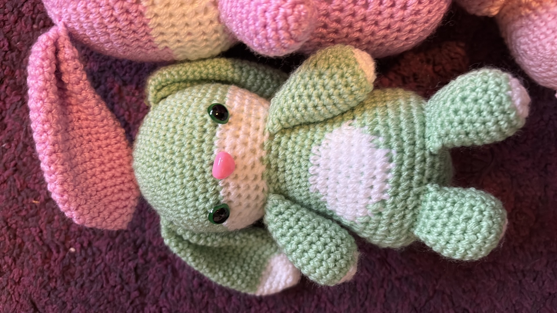 Konijntjes in verschillende kleuren. Gemaakt van acrylgaren en gevuld met gerecycled polyester vulwatten. De oogjes zijn hard, dus pas op bij kleine kinderen.