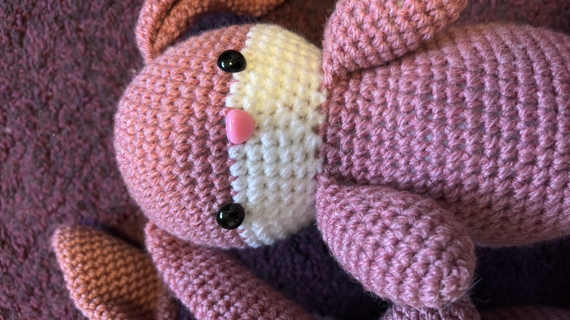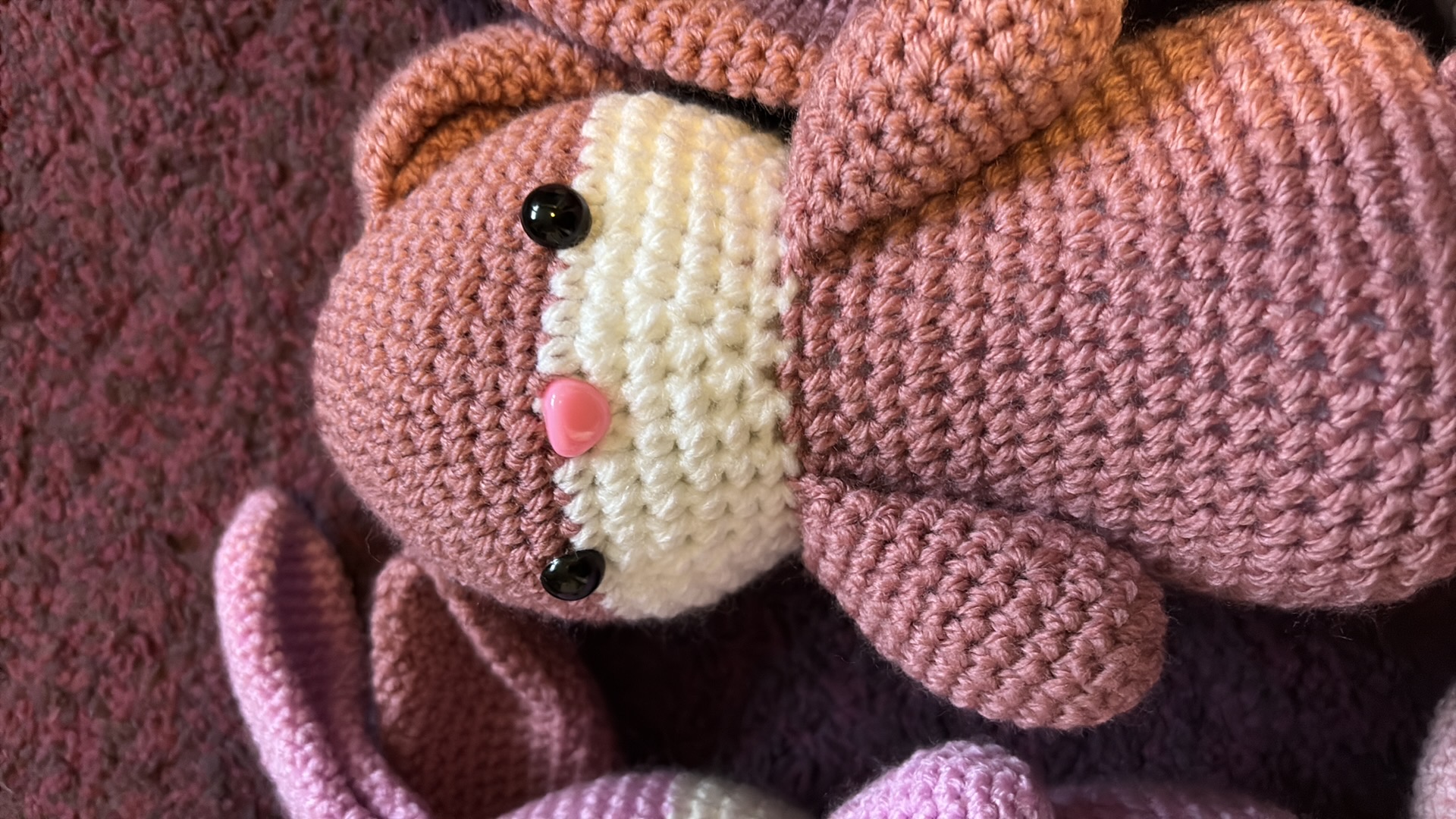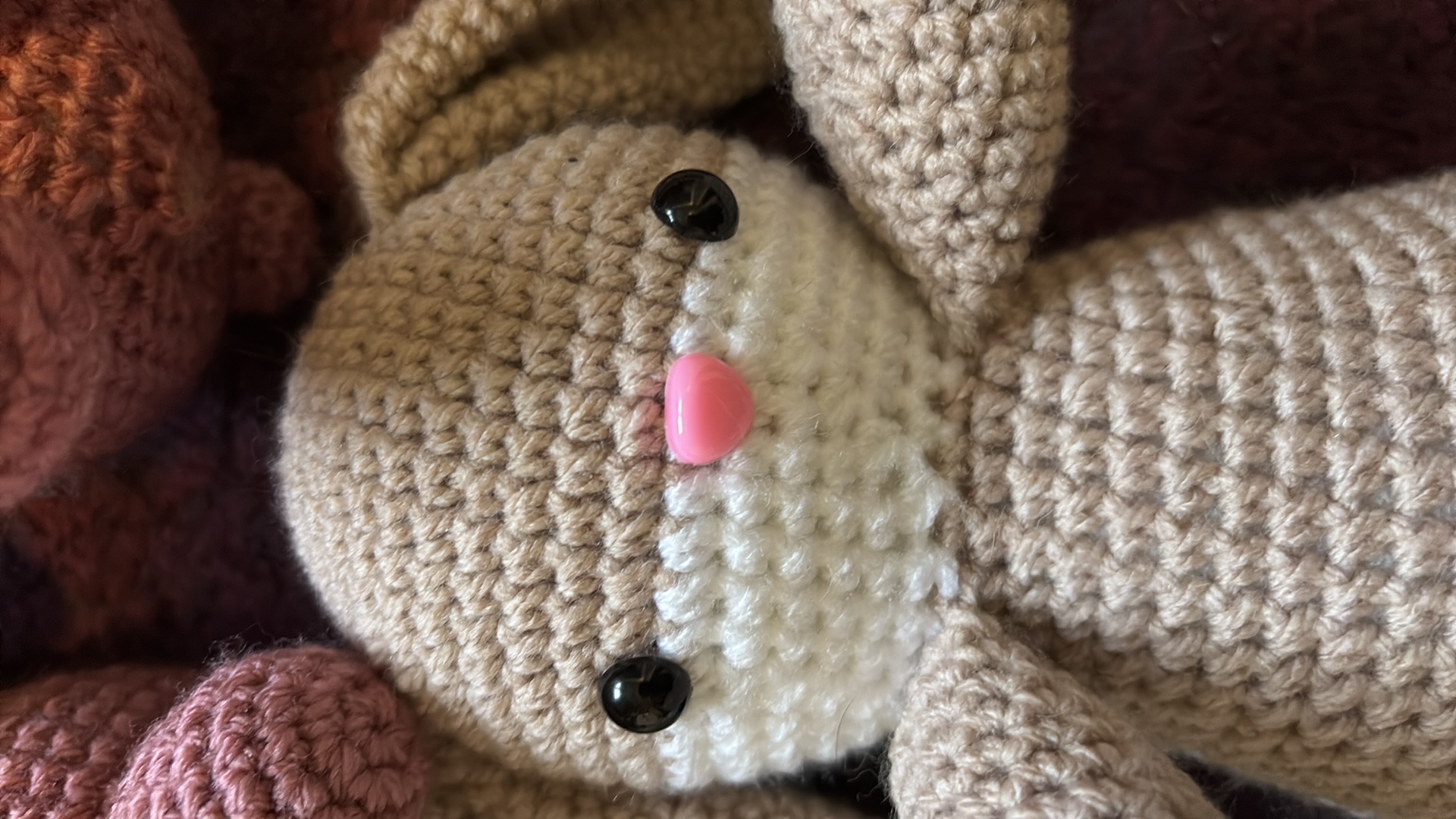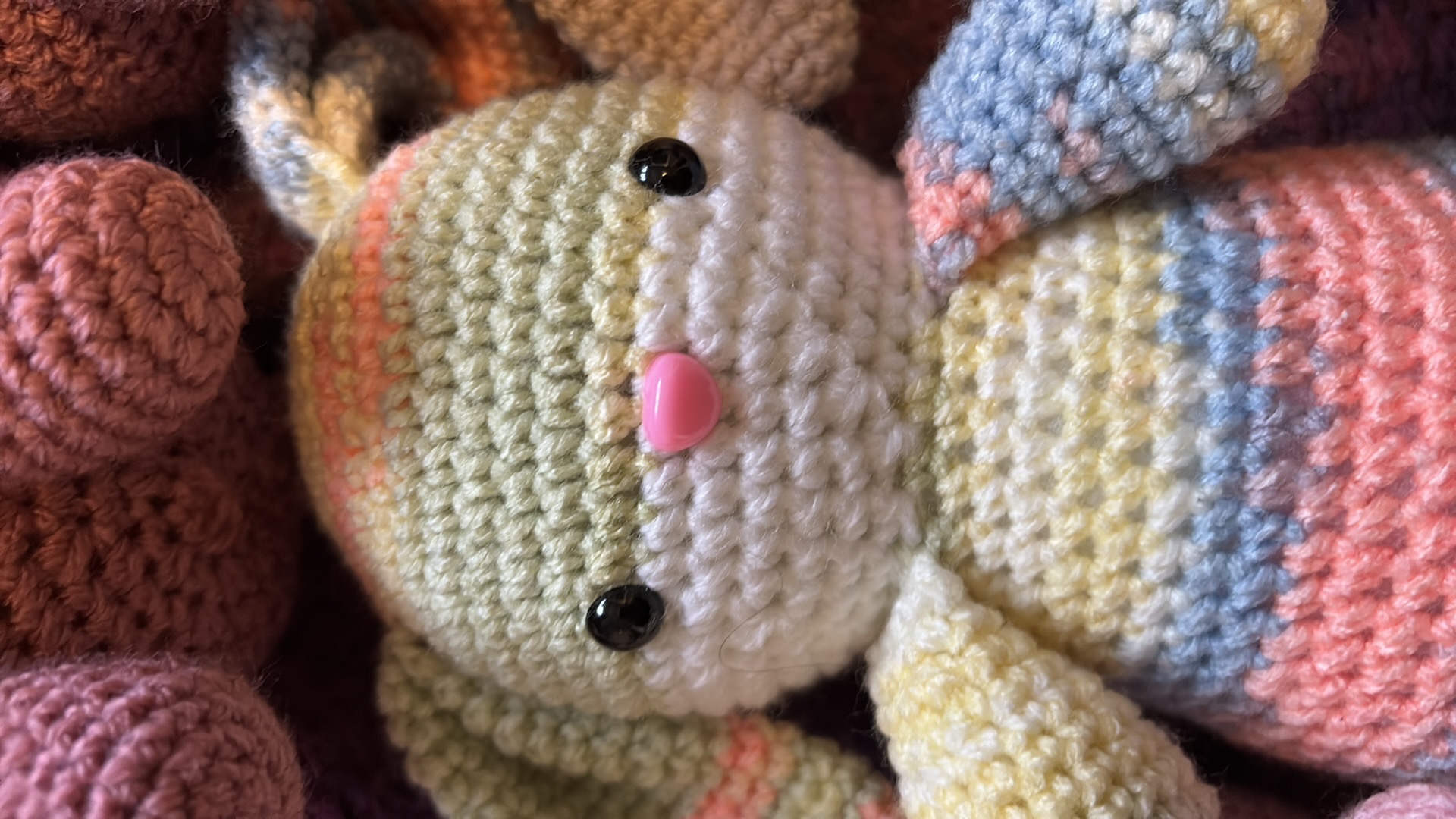 Konijntjes in verschillende kleuren. Gemaakt van acrylgaren en gevuld met gerecycled polyester vulwatten. De oogjes zijn hard, dus pas op bij kleine kinderen.