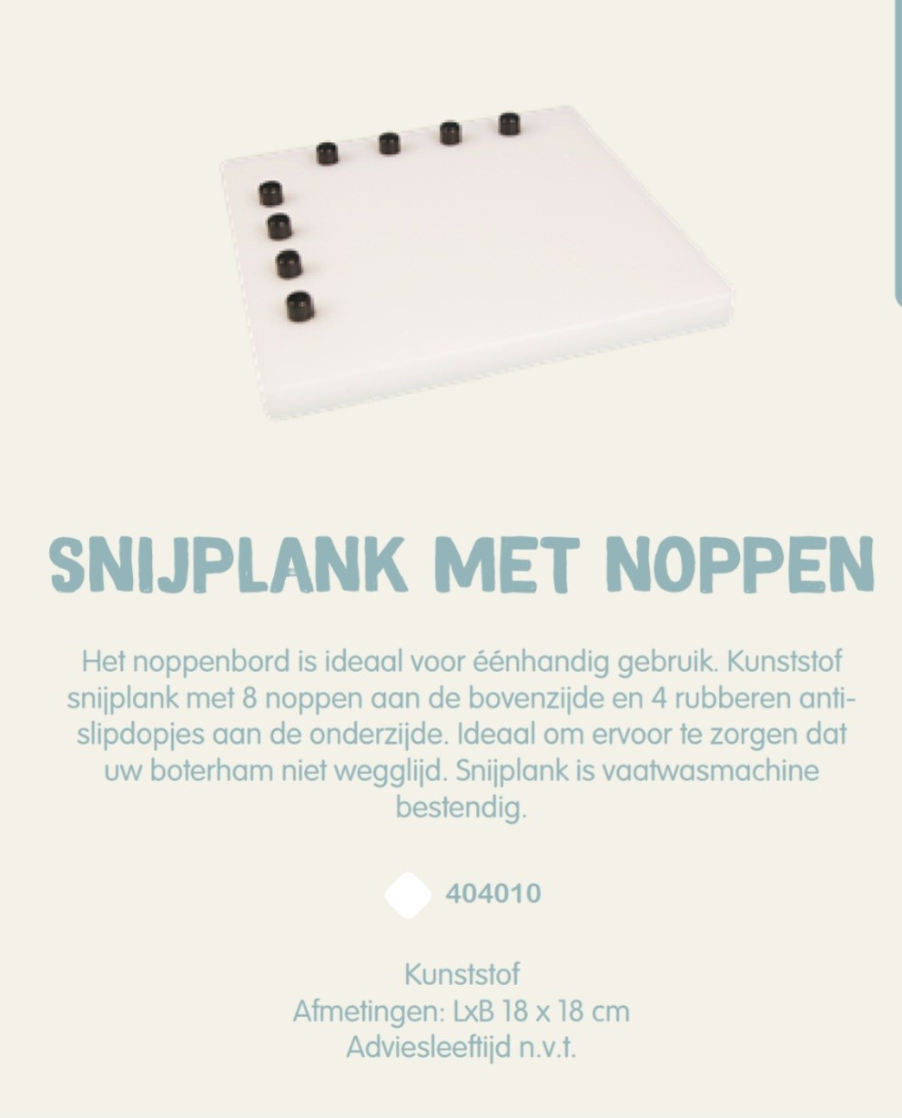 Dit noppenbord snijplank is ideaal voor eenhandig gebruik. Het kunststof noppenbord heeft acht noppen aan de bovenzijde en ook vier rubberen anti-slip dopjes aan de onderzijde. Deze noppen zorgen ervoor dat het noppenbord snijplank niet wegglijdt. Hierdoor zal het snijden gemakkelijker worden. De noppen aan de bovenzijde zorgen ervoor dat bijvoorbeeld je brood op z’n plek blijft bij het snijden en smeren. Zelfs mensen met verminderde functionaliteit in de handen zullen met dit noppen bord weer zelfstandig brood kunnen smeren. De snijplank is gemaakt van kunststof. Hierdoor kun je de snijplank gemakkelijk schoonmaken en is het noppenbord ook geschikt voor de vaatwasser. Door het lichte gewicht van slechts 470 gram en handzame formaat van 18 x 18 cm kun je het noppenbord makkelijk verplaatsen.